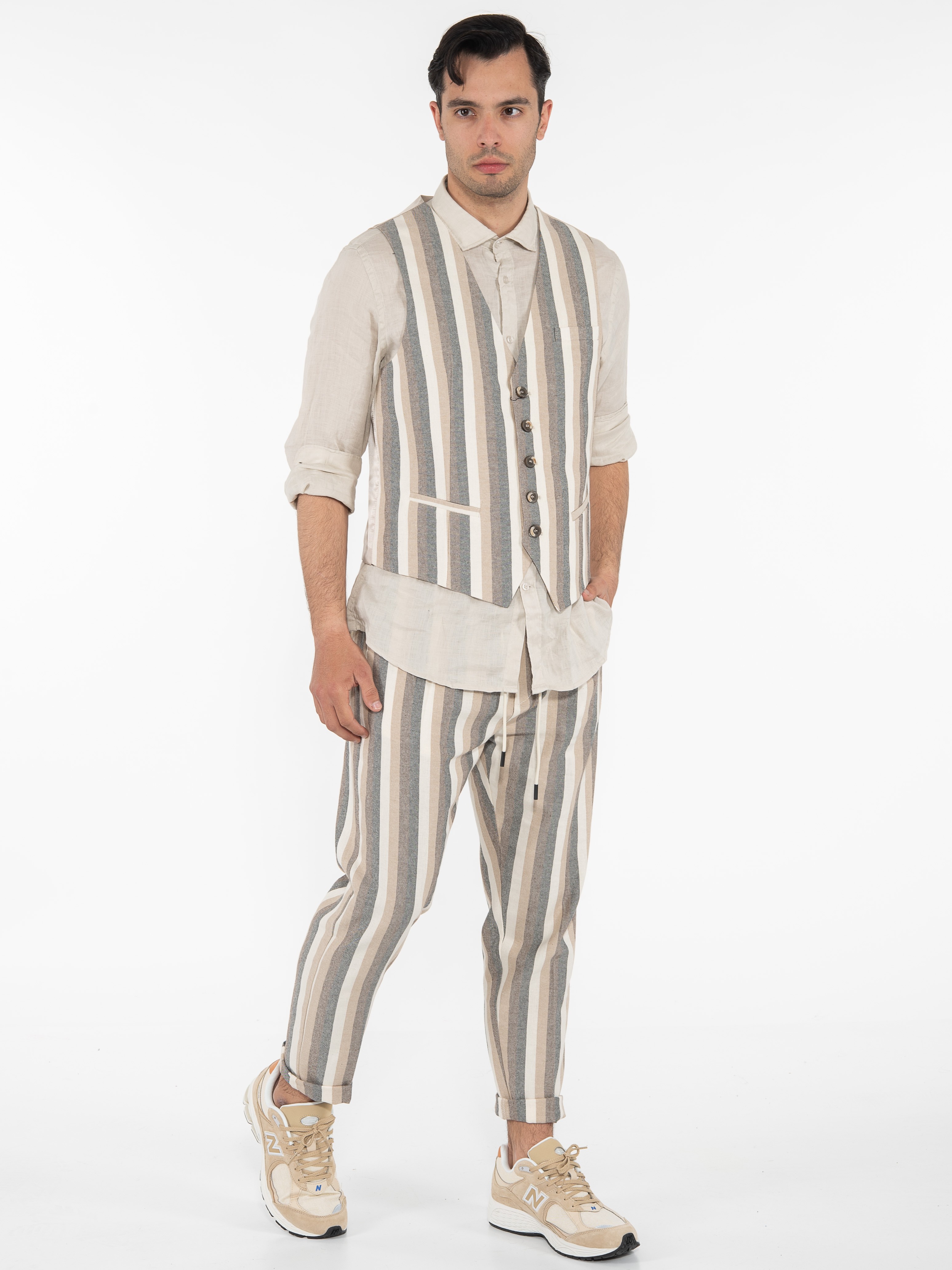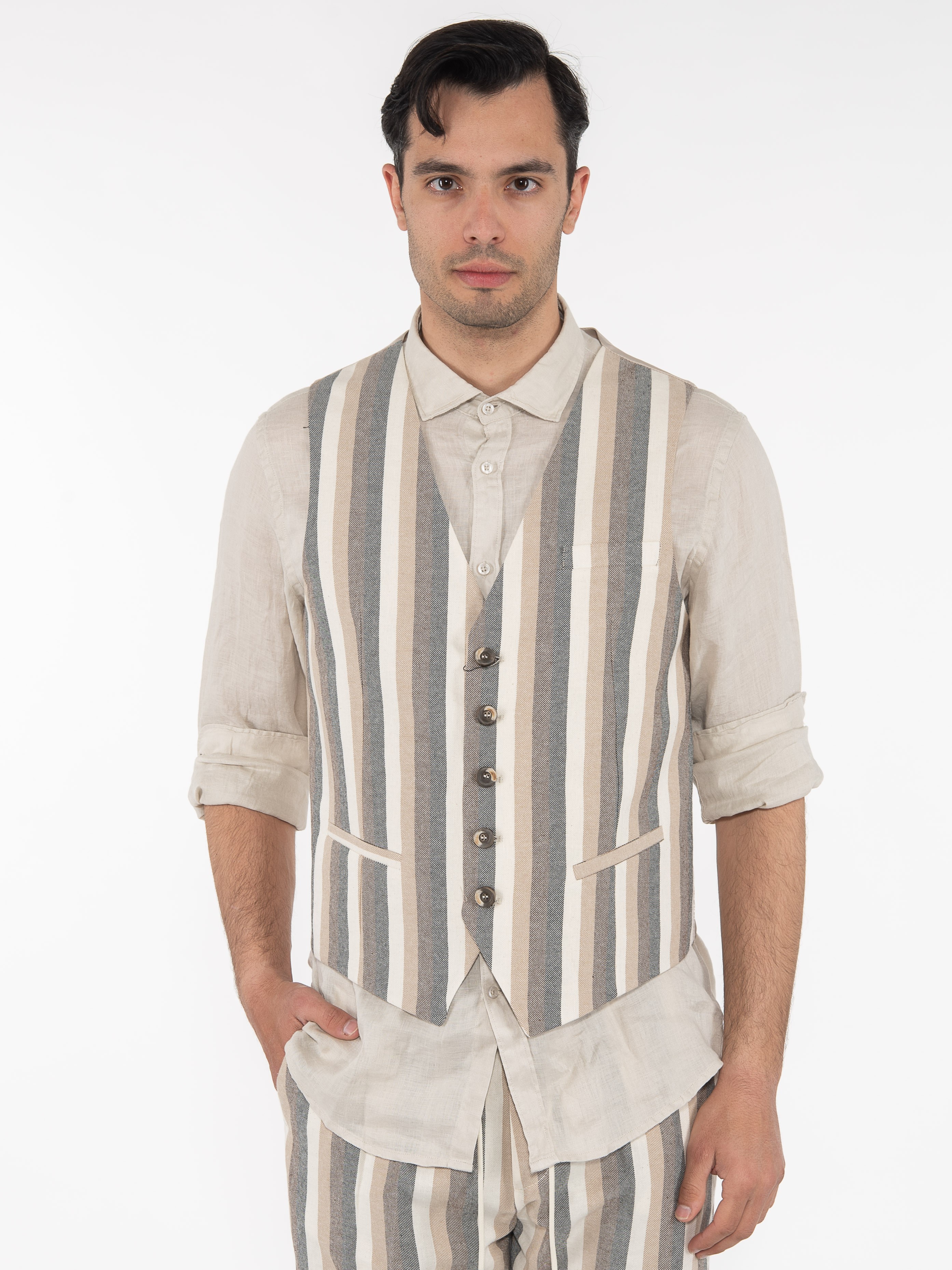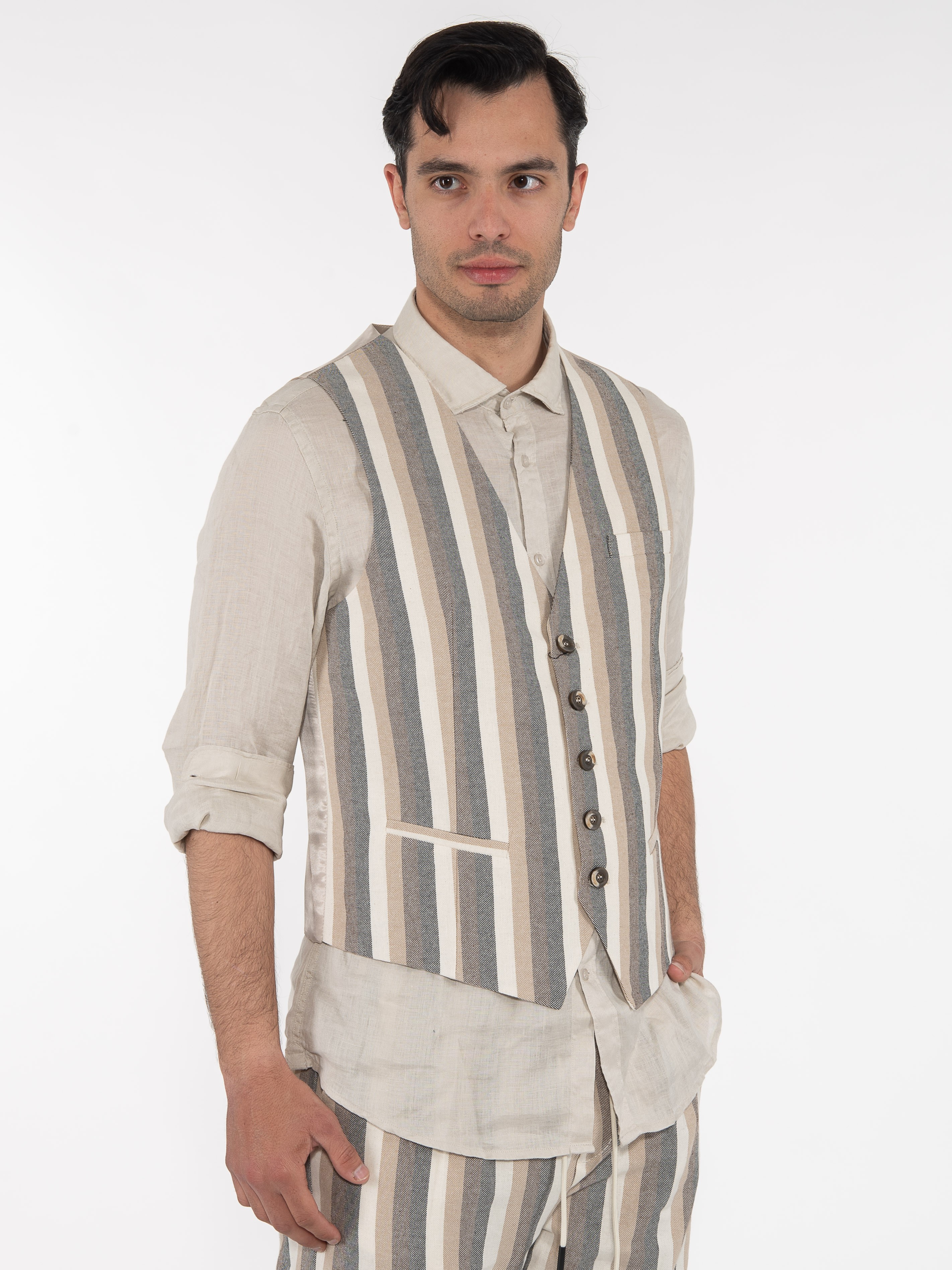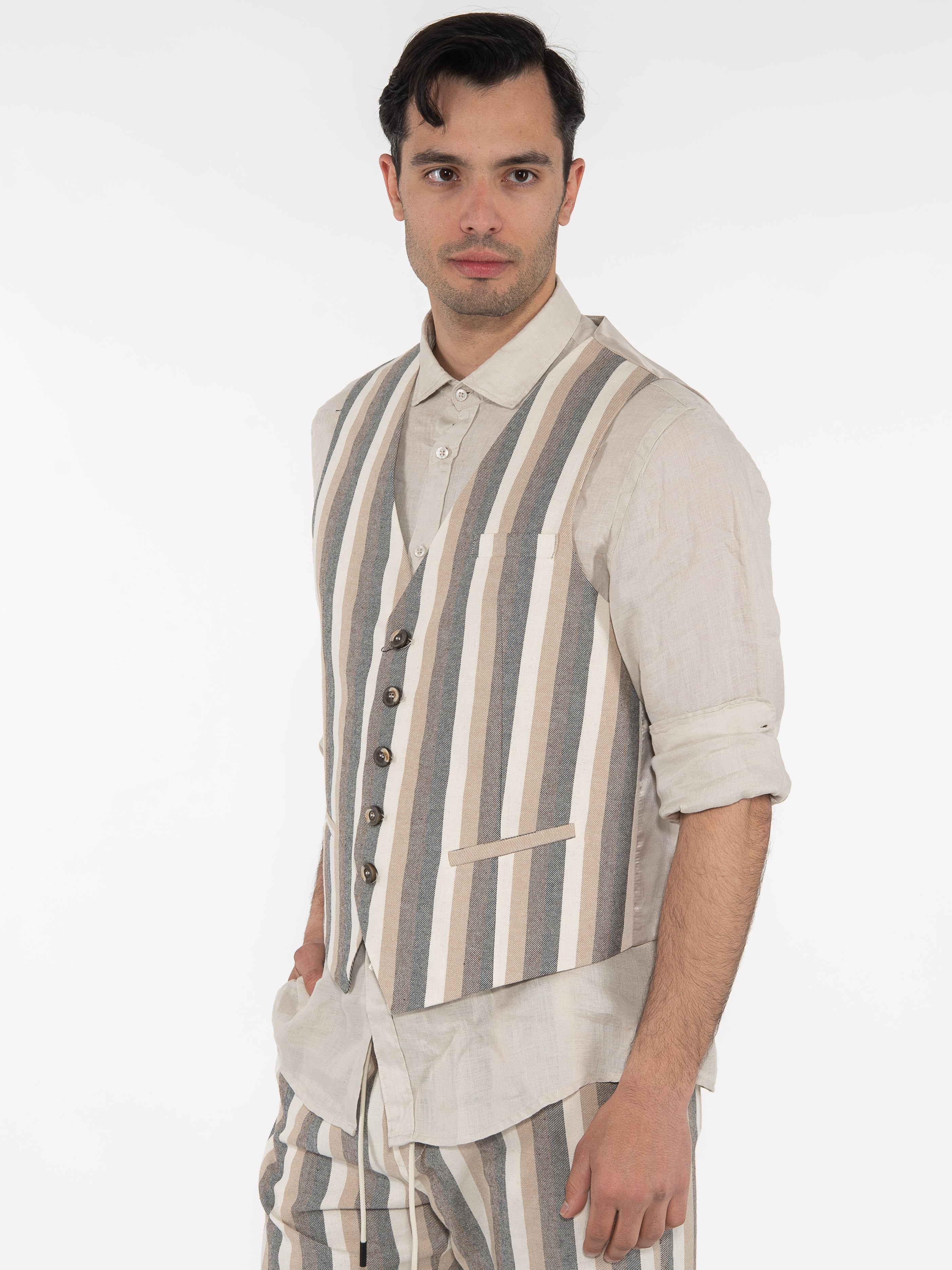 Χαρακτηριστικά: Γιλέκο ριγέ σε slim fit γραμμή με διαφορετικό ύφασμα στην πίσω πλευρά. 70% cotton 22% polyester 8% linen