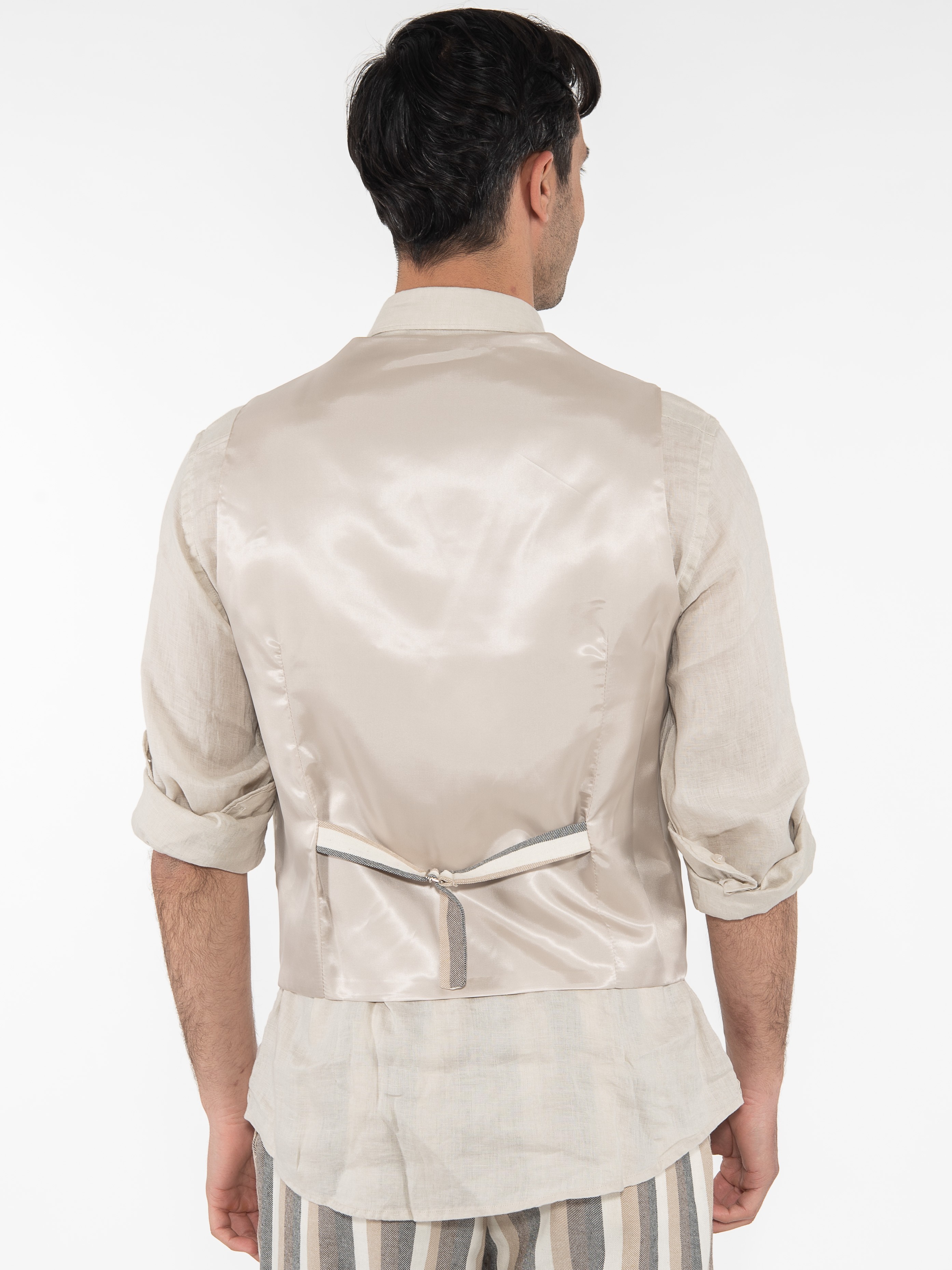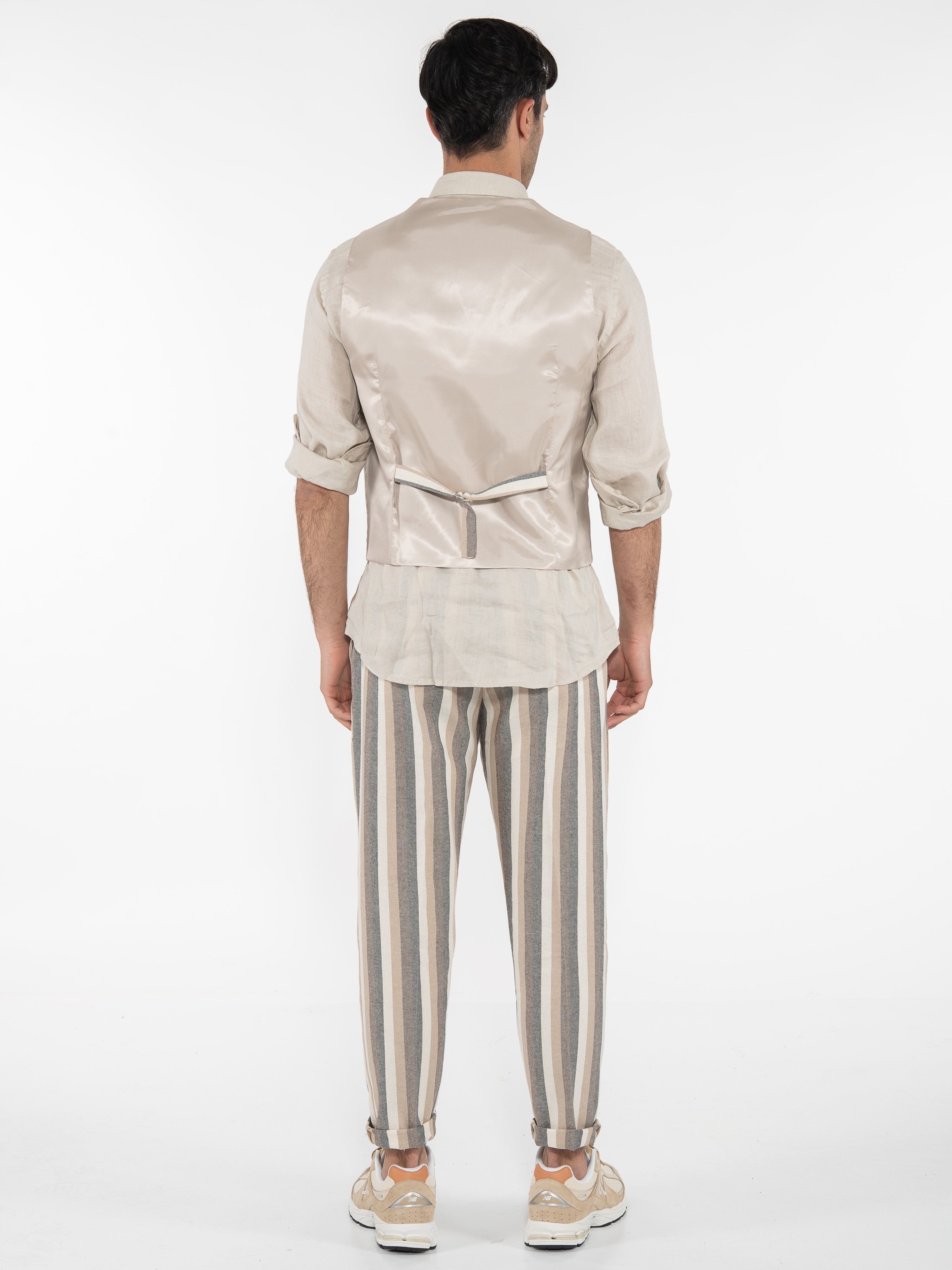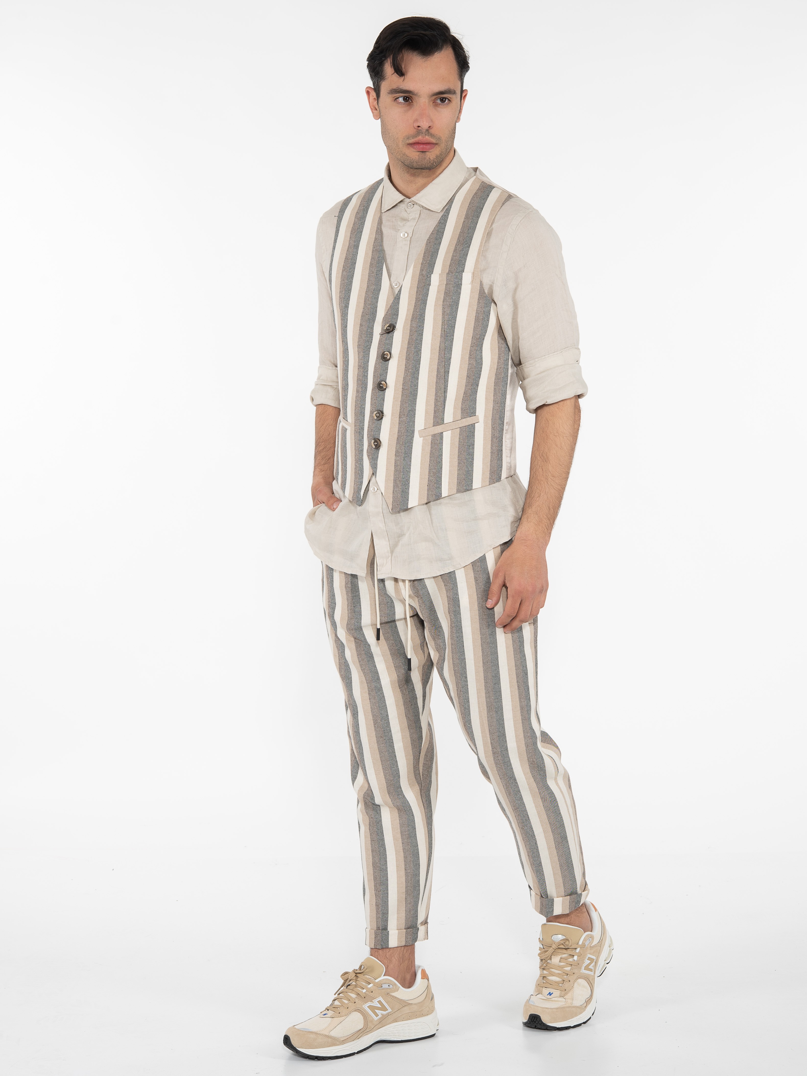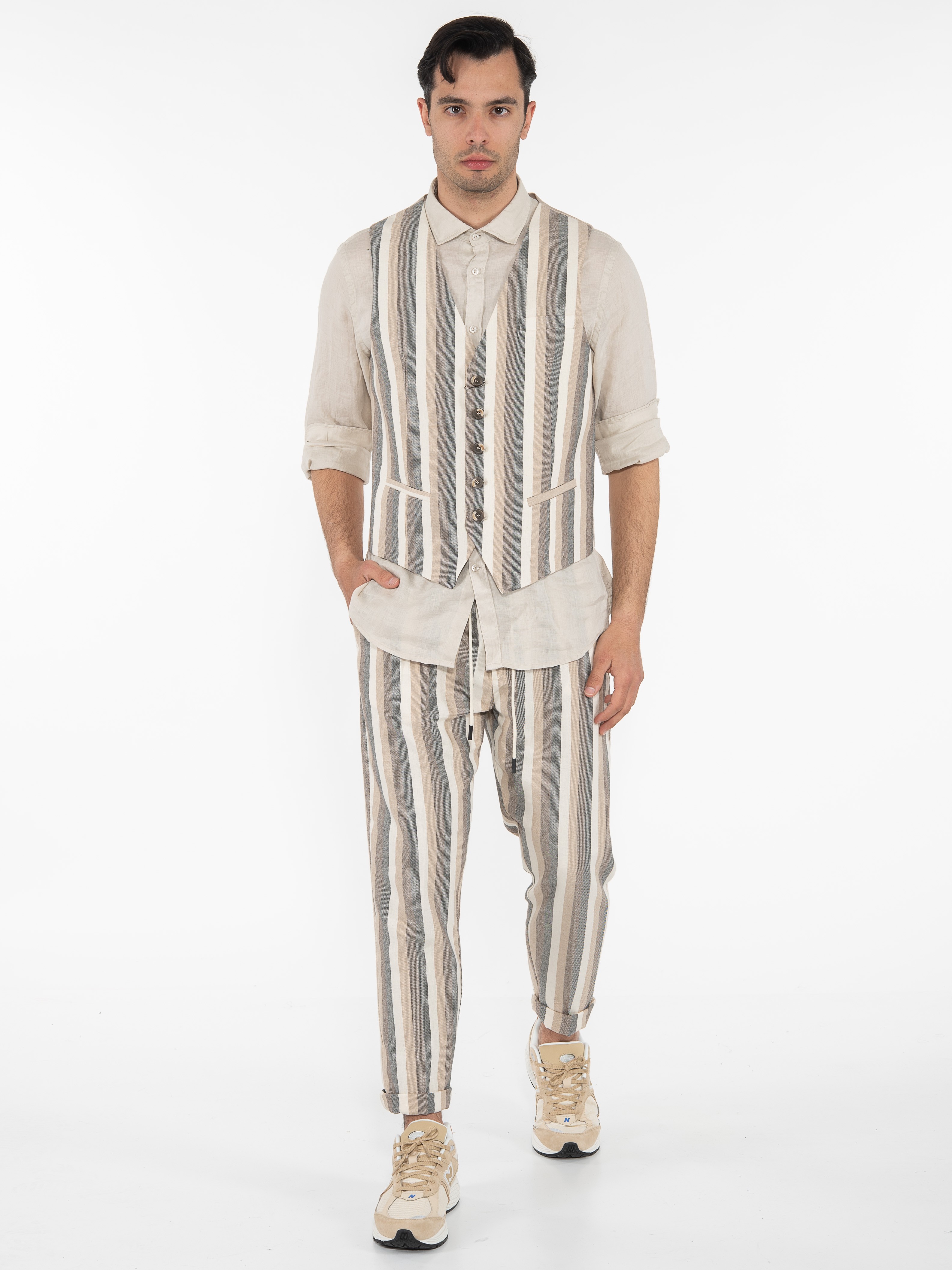 Χαρακτηριστικά: Γιλέκο ριγέ σε slim fit γραμμή με διαφορετικό ύφασμα στην πίσω πλευρά. 70% cotton 22% polyester 8% linen