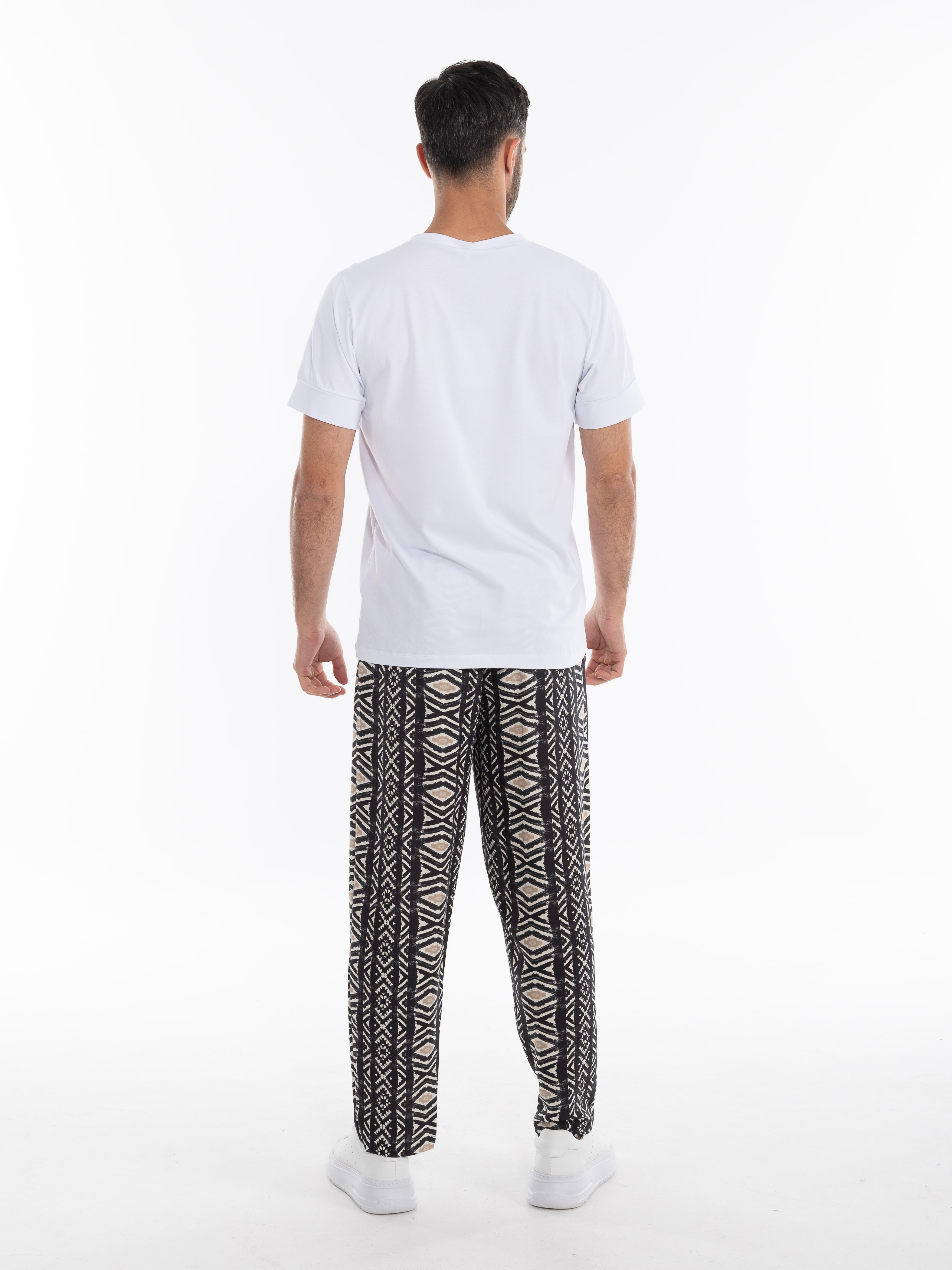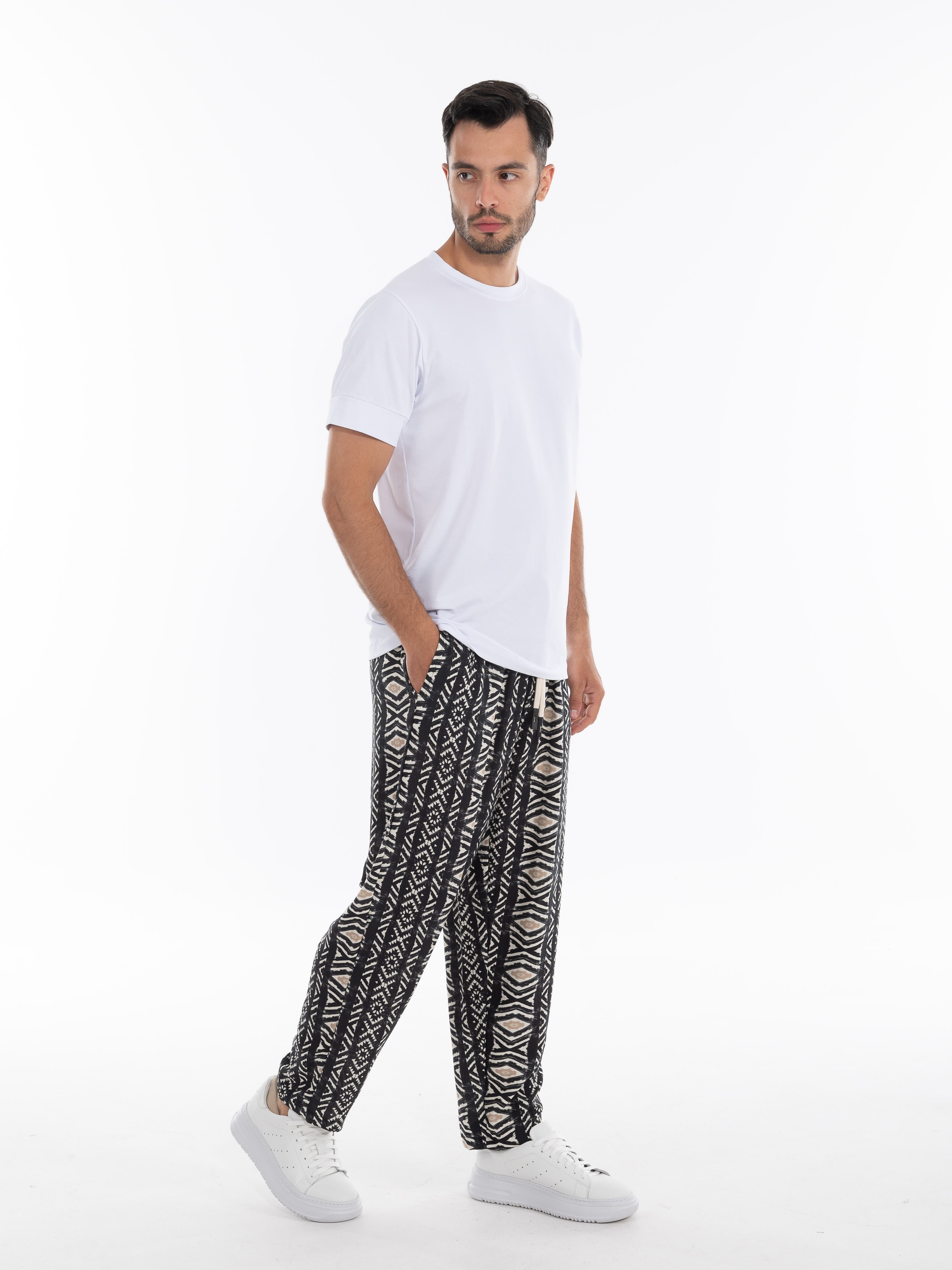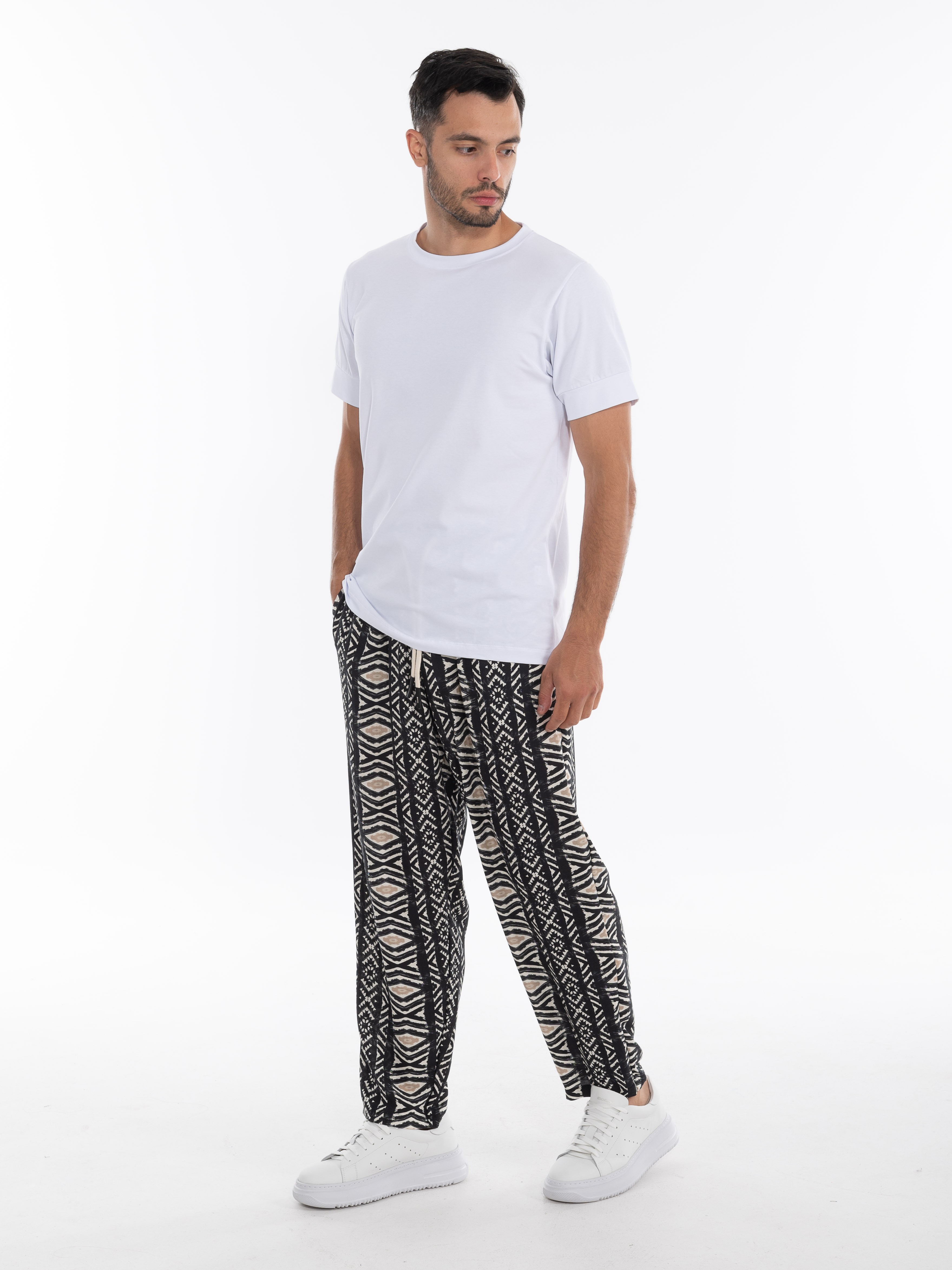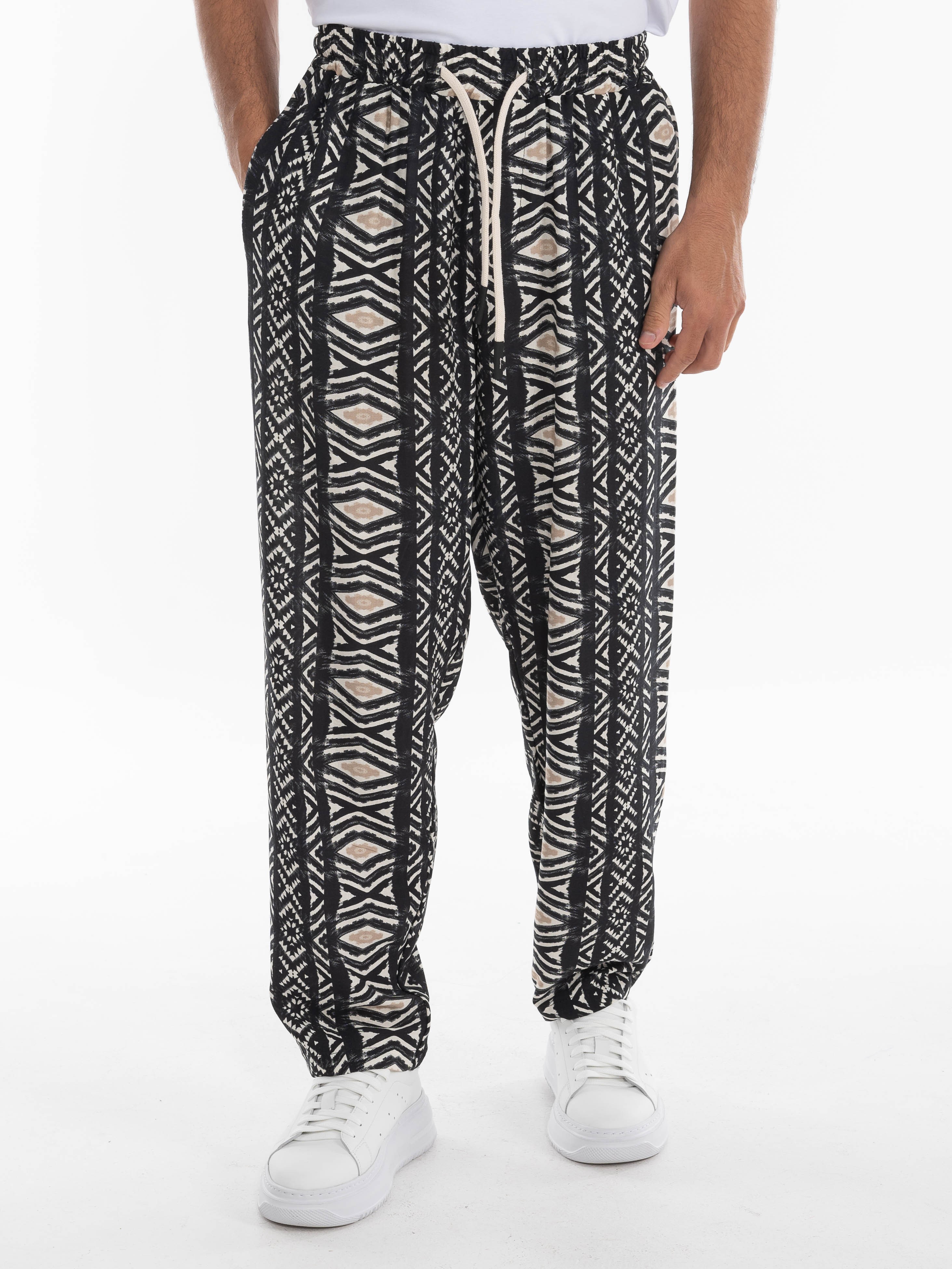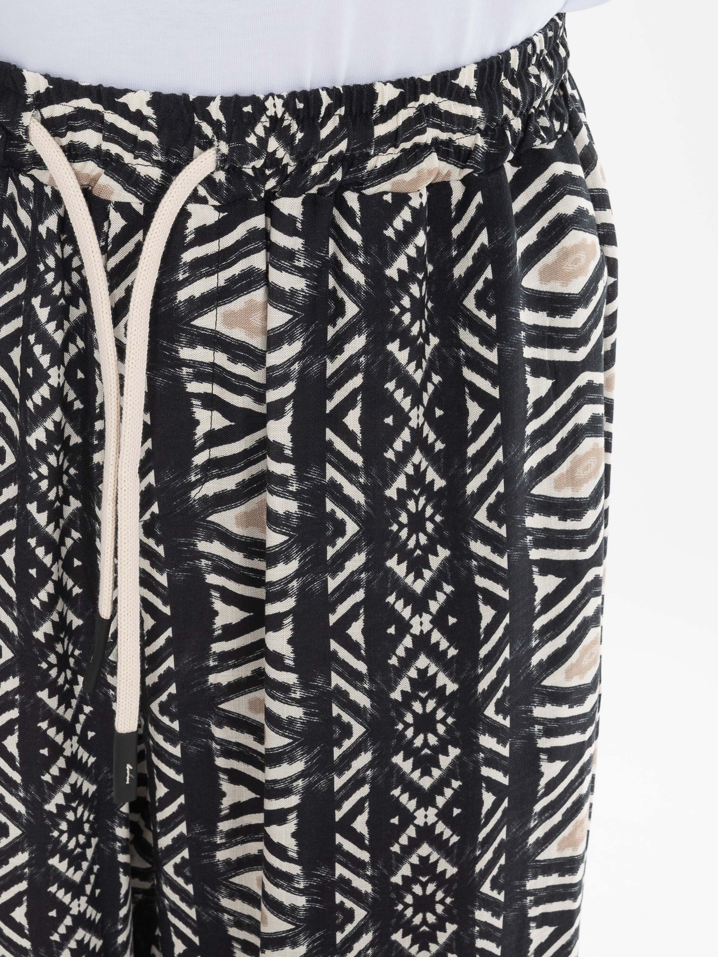 Χαρακτηριστικά: >: Παντελόνι λινό fullprinted σε regular fit γραμμή με λάστιχο και κορδόνι στη μέση. 55% linen 45% viscose