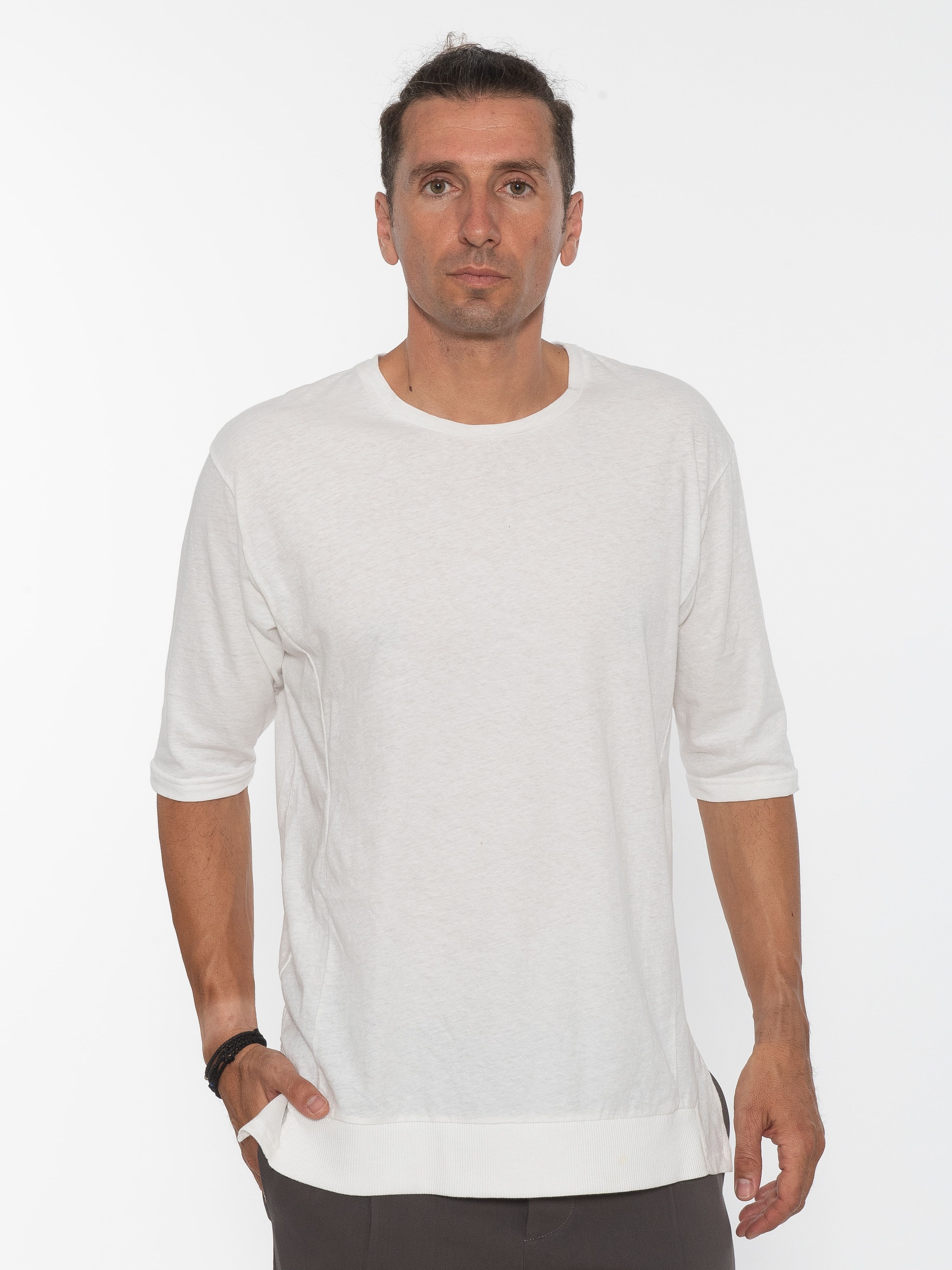 Χαρακτηριστικά: T-shirt σε regular fit γραμμή με λάστιχο στο τελείωμα και εξώραφα. 80% cotton 20% linen