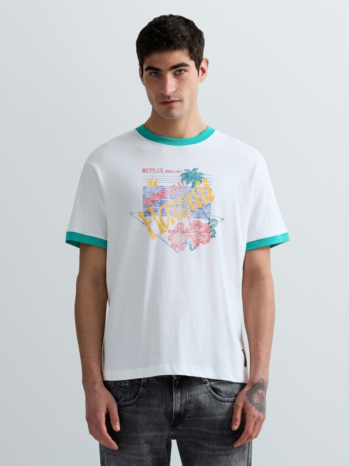 Χαρακτηριστικά: T-shirt σε regular fit γραμμή με ριπ στο λαιμό και στα μανίκια και με στάμπα στο στήθος. 100% cot