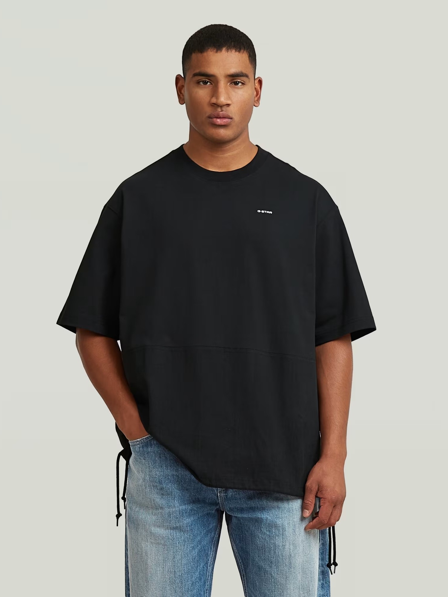 Χαρακτηριστικά: T-shirt σε oversized fit γραμμή με διαφορετικά υφάσματα στη μέση και κορδόνι στο πλάι στο τελείωμα. 100% cot