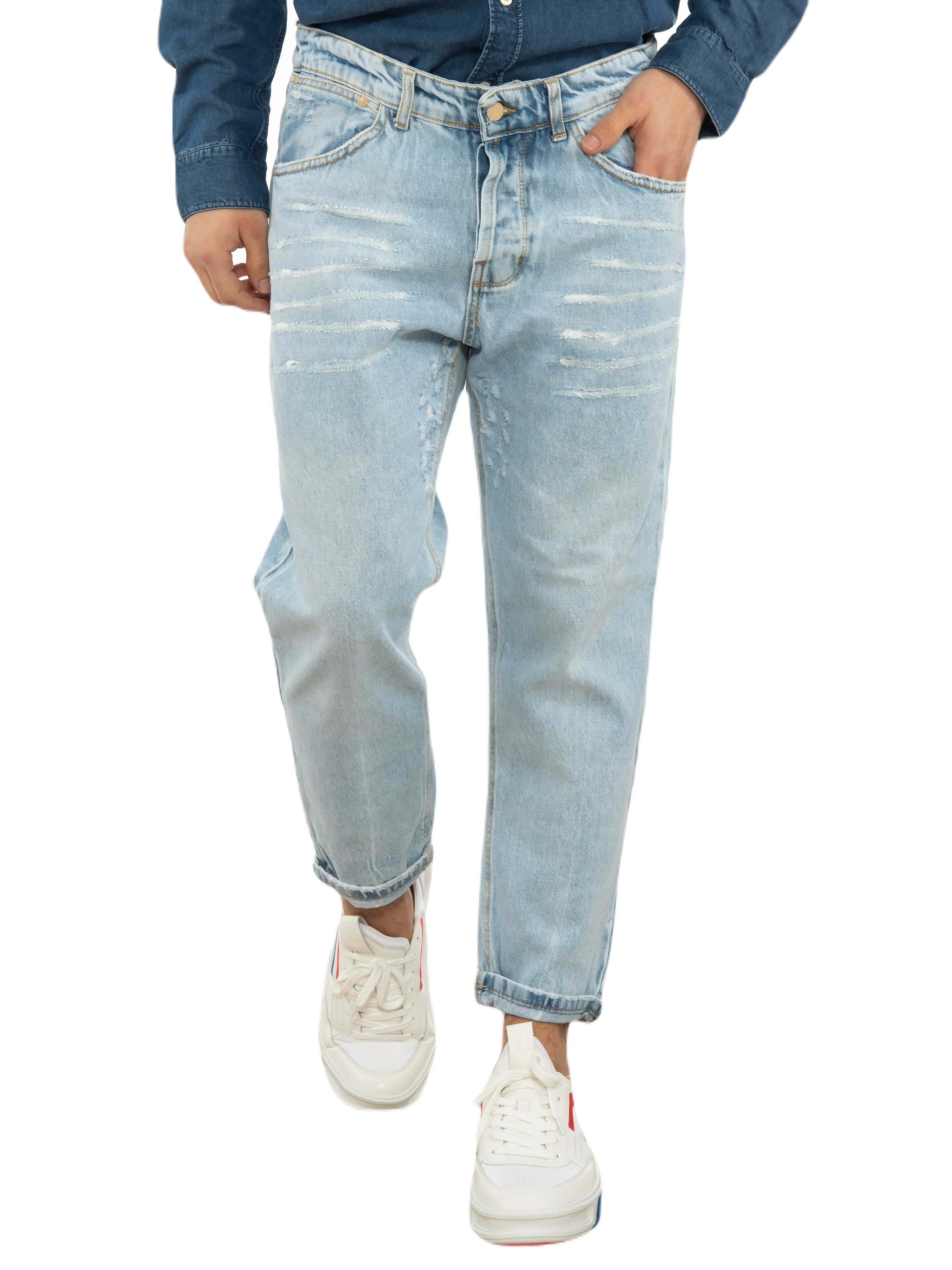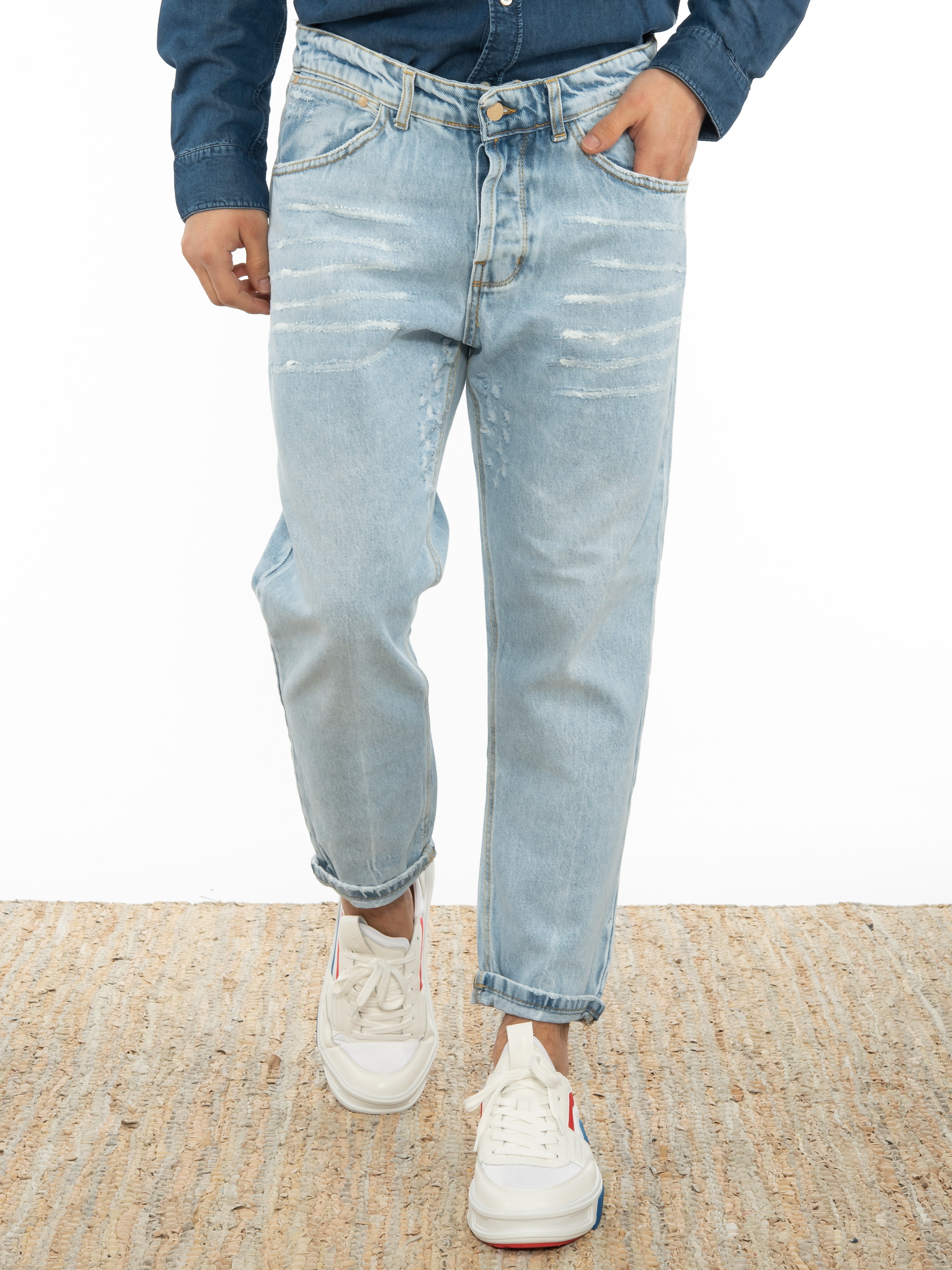 Features : Jean Pants in regular fit line with wear and tear. 100% cotton