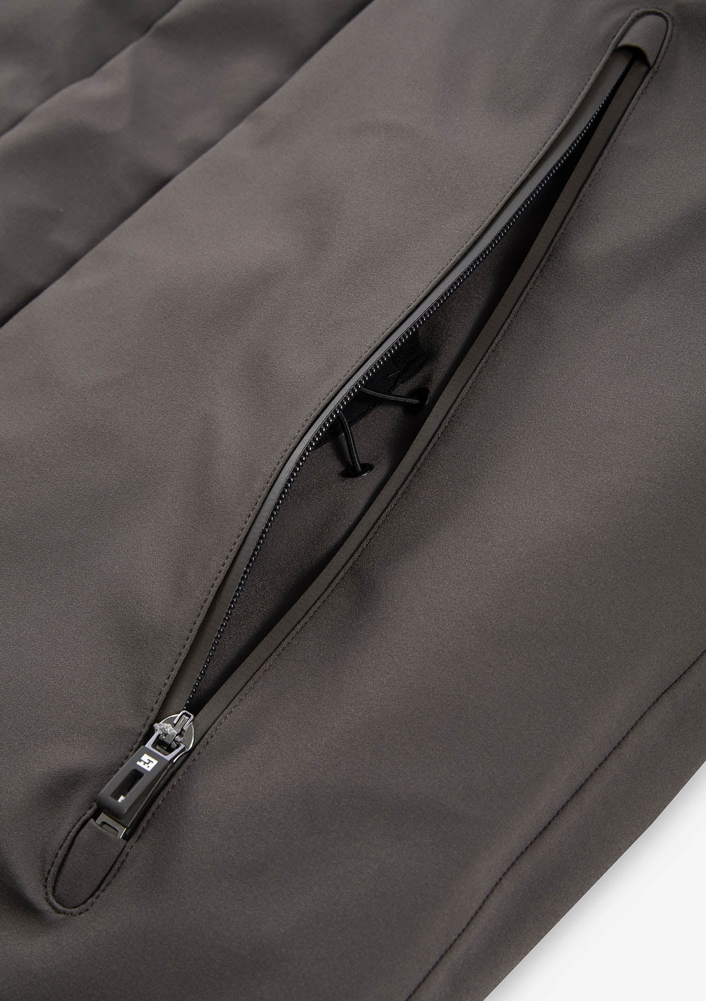 Durable stretch nylon with a matte finish is tear-resistant and adapts to movement. A three-layer construction with a TPU membrane and PFC-free water-repellent finish provides protection from wind and moisture. 85 % nylon, 15 % spandex.