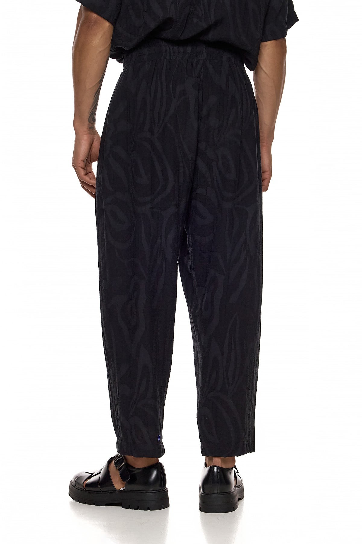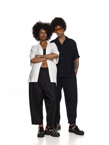 Features: Pants in loose fit line with elastic waist, baggy and with embossed tone to tone design. 80% visc 20% pol