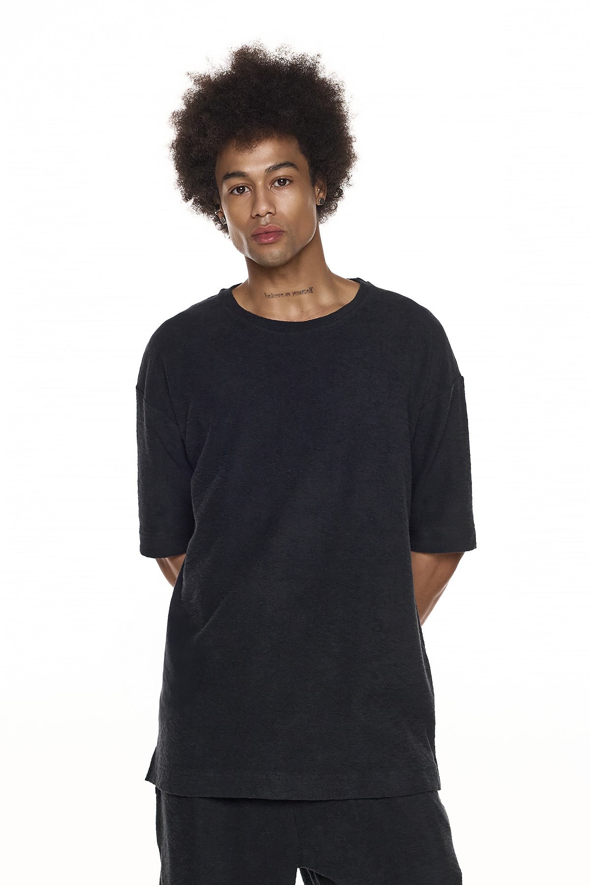 Features: Regular fit terry T-shirt. 100% cotton