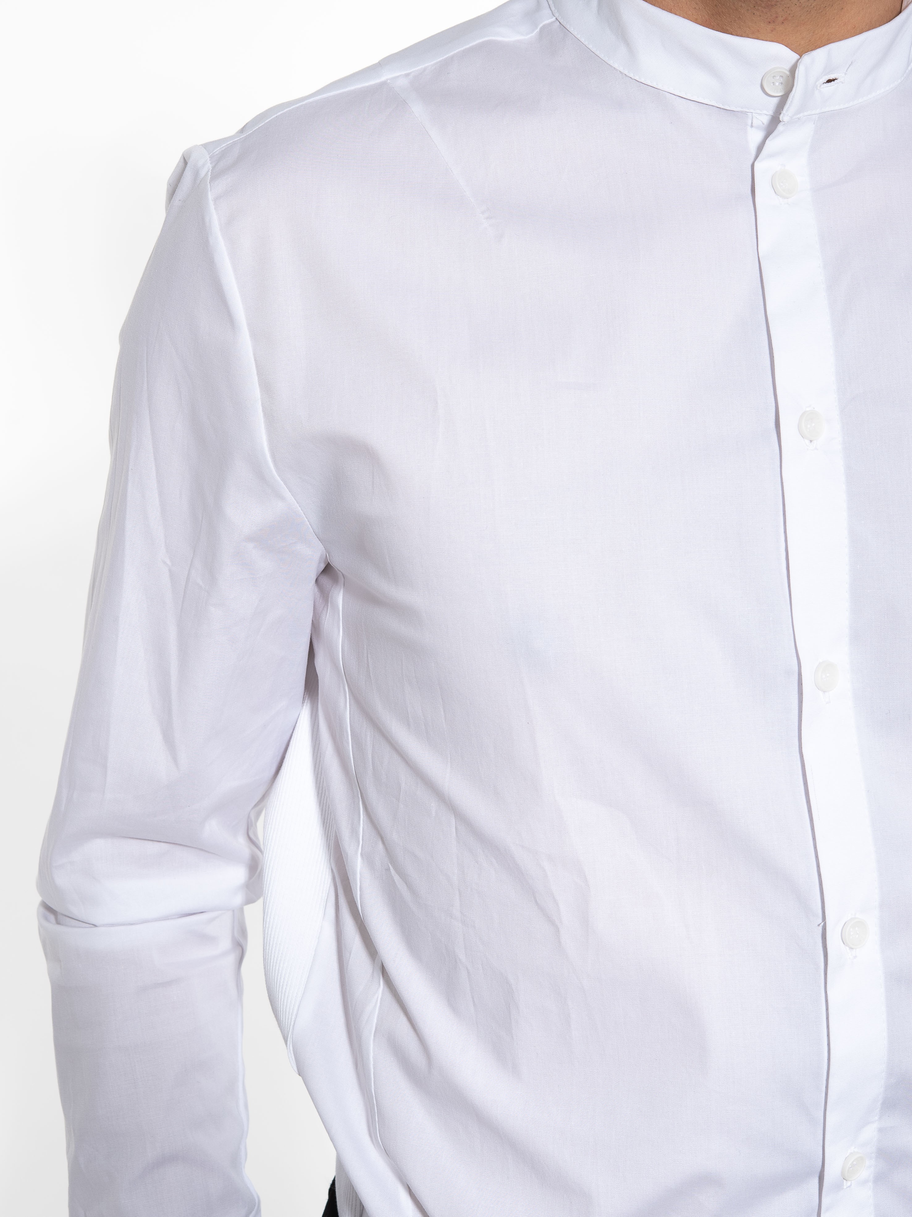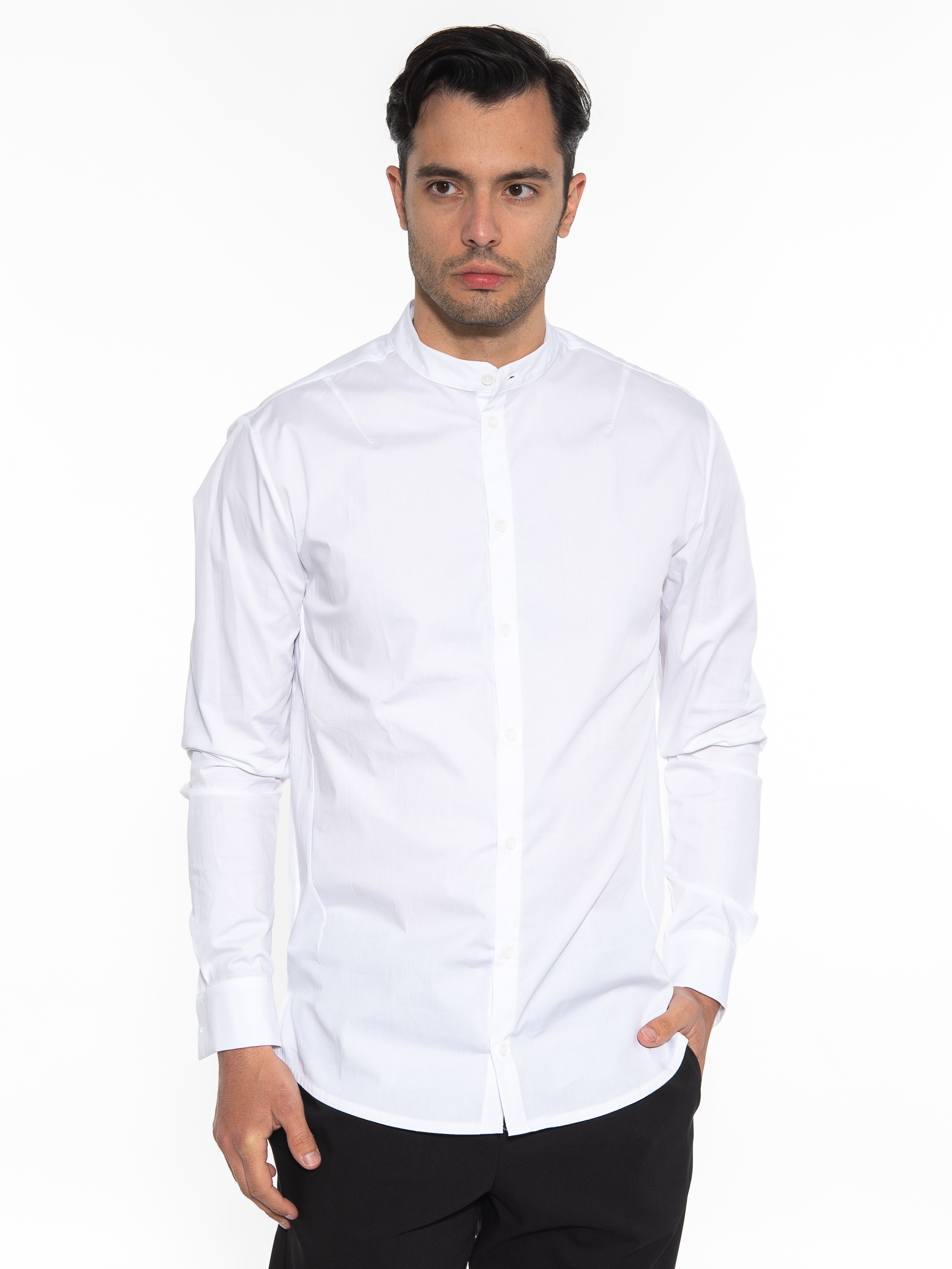 Features : Mao poplin shirt in slim fit line with rip elastic on the side. 97% cotton 3% elastane