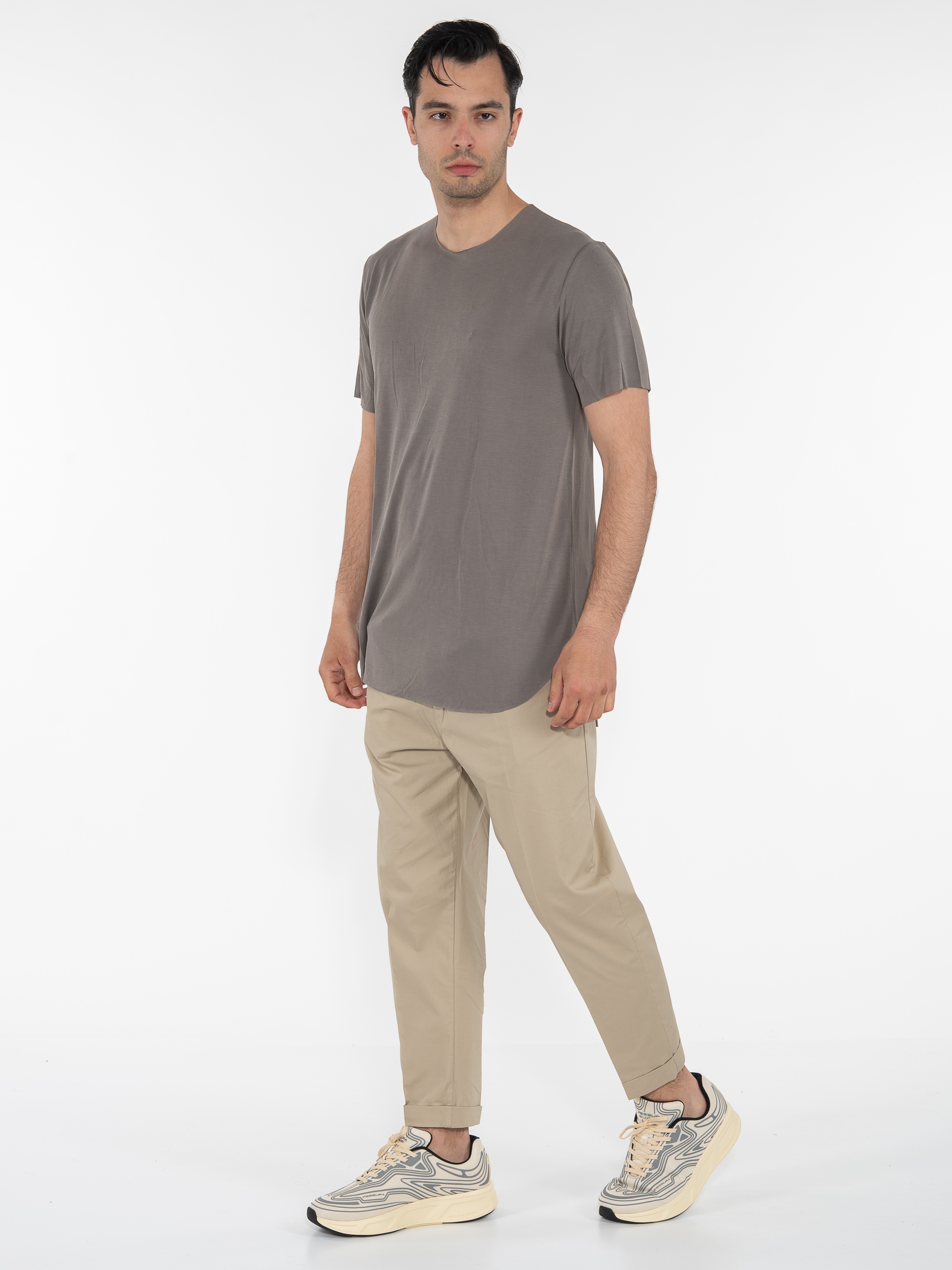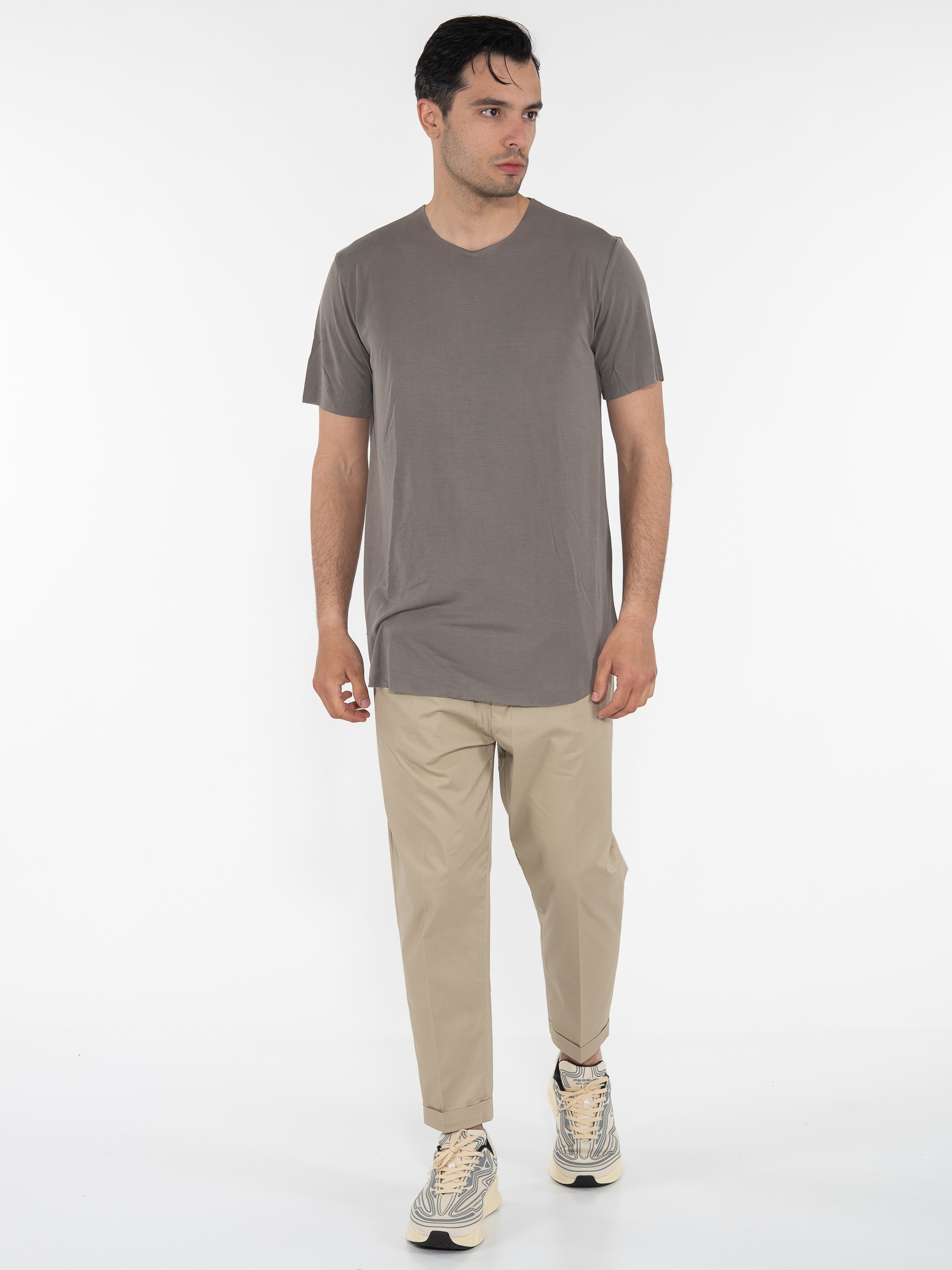 Features : Asymmetrical T-shirt in regular fit line laser cut on the neck, sleeves and finish. 67% modal 33% polyester