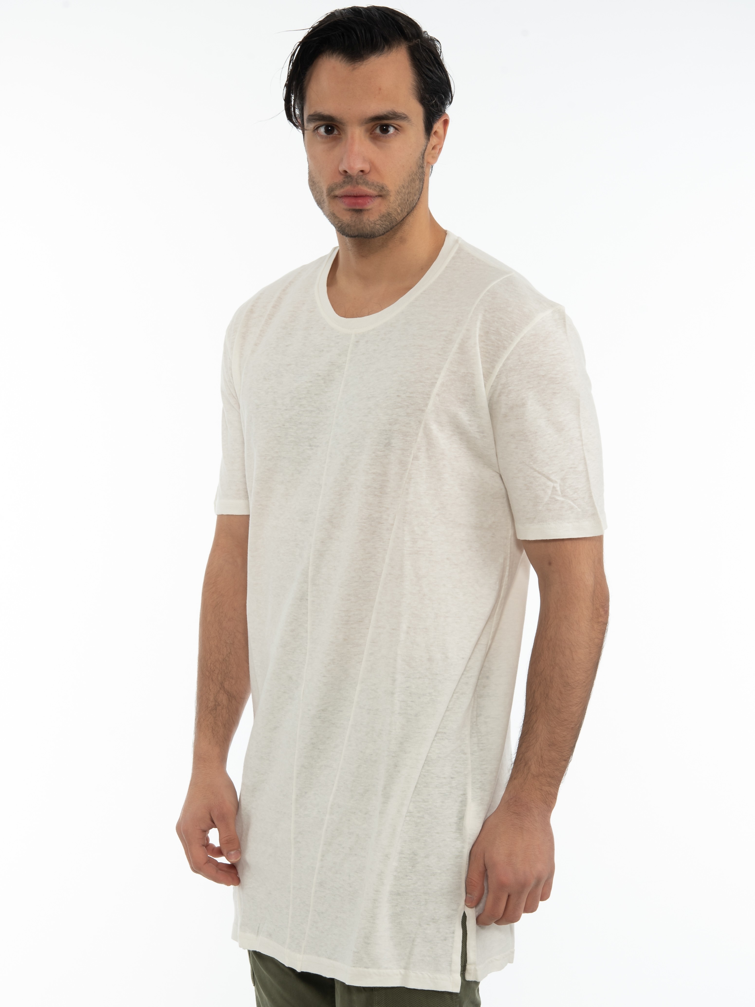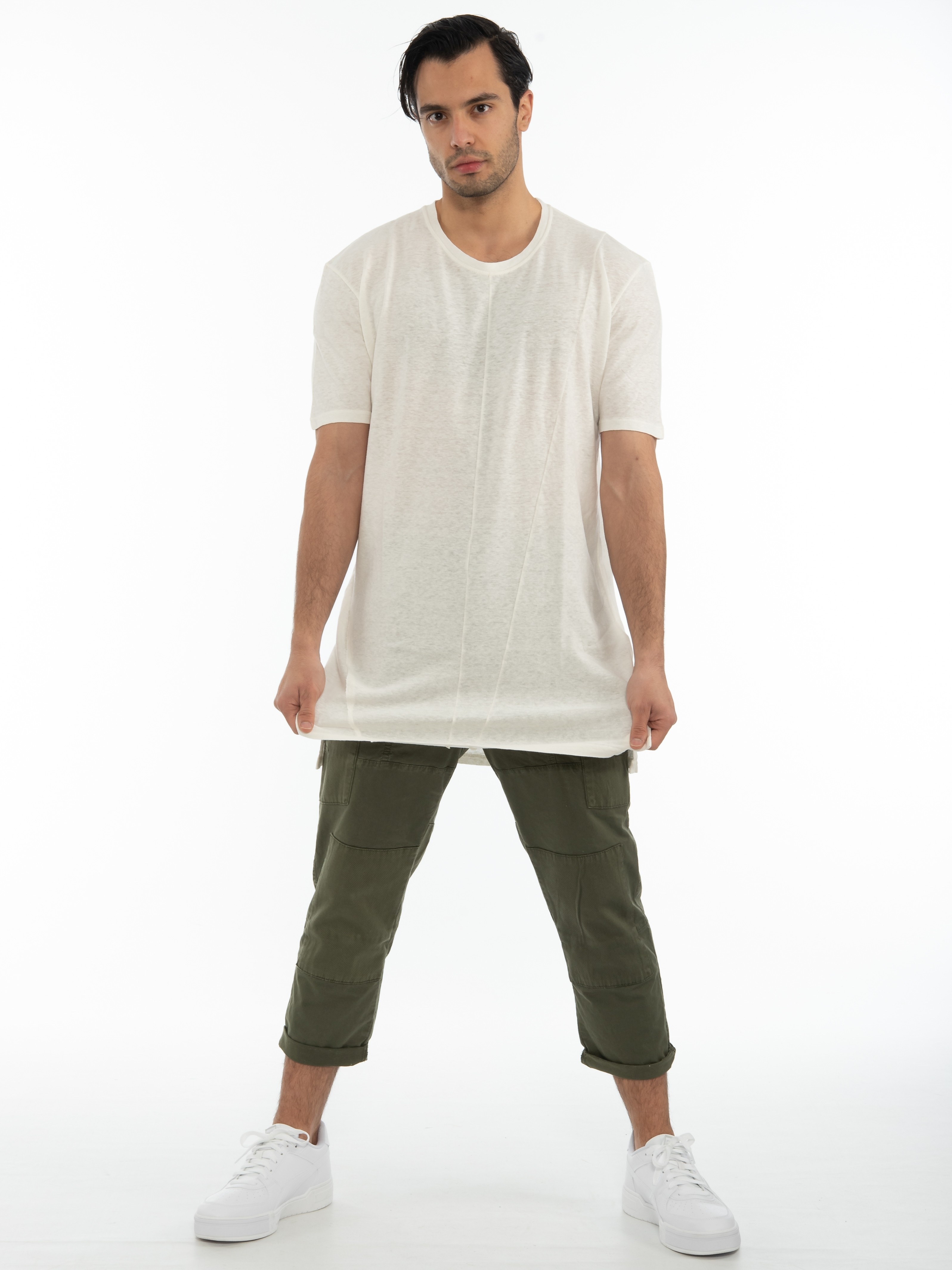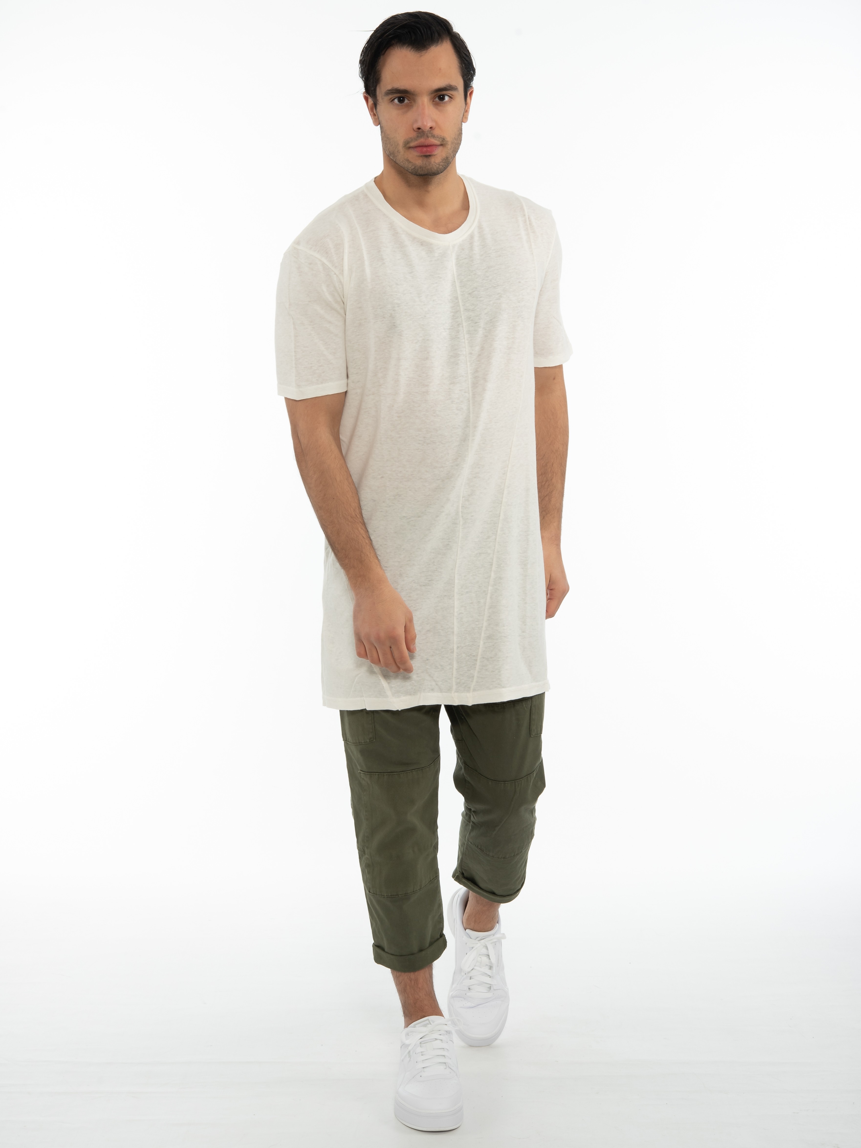 Features : T-shirt in slim fit line with overalls and tear on the side. 45% cotton 55% linen