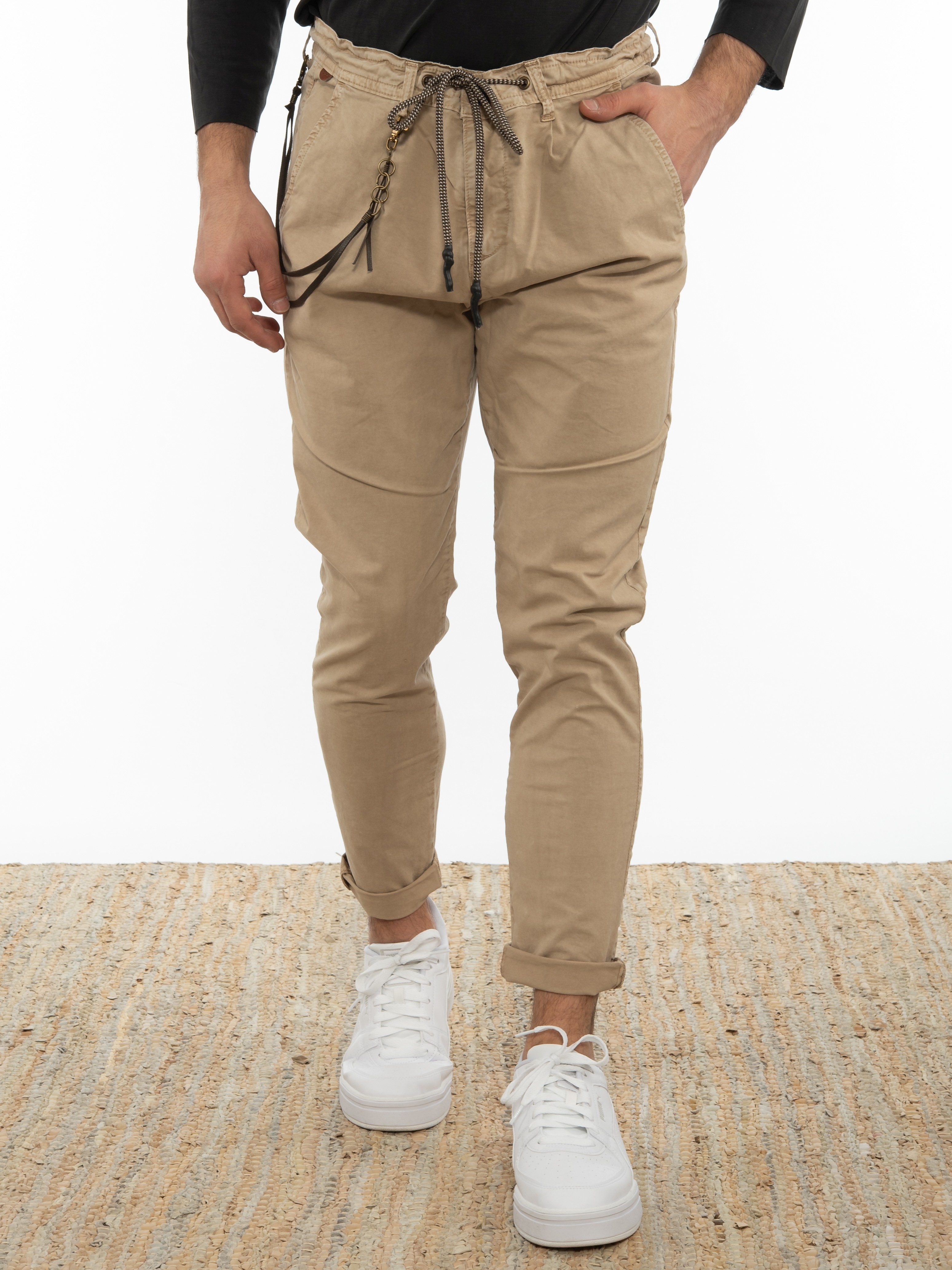 Features : Chino pants in slim fit line with integrated belt-drawstring and accessory chain. 97% cotton 3% elastane