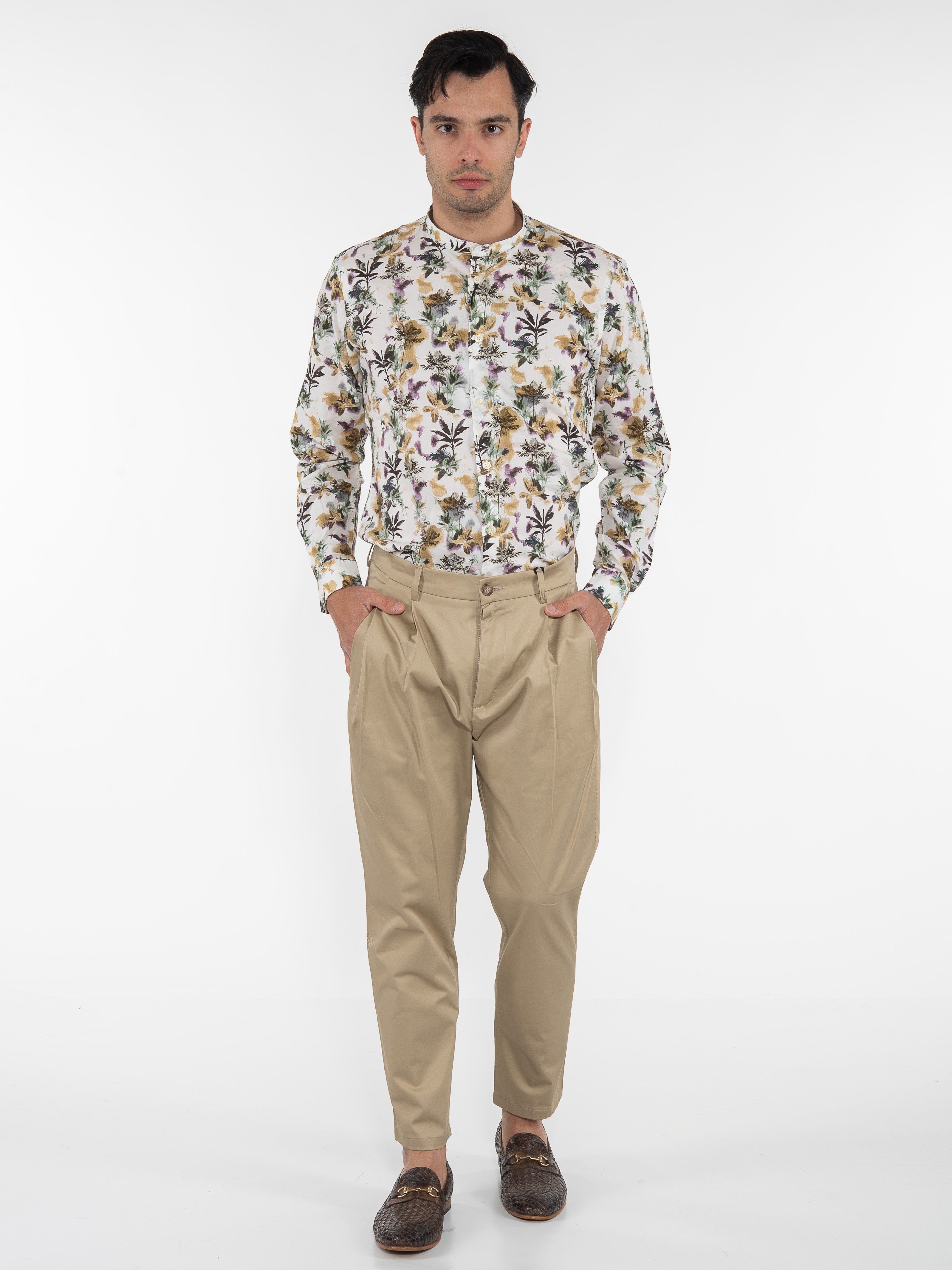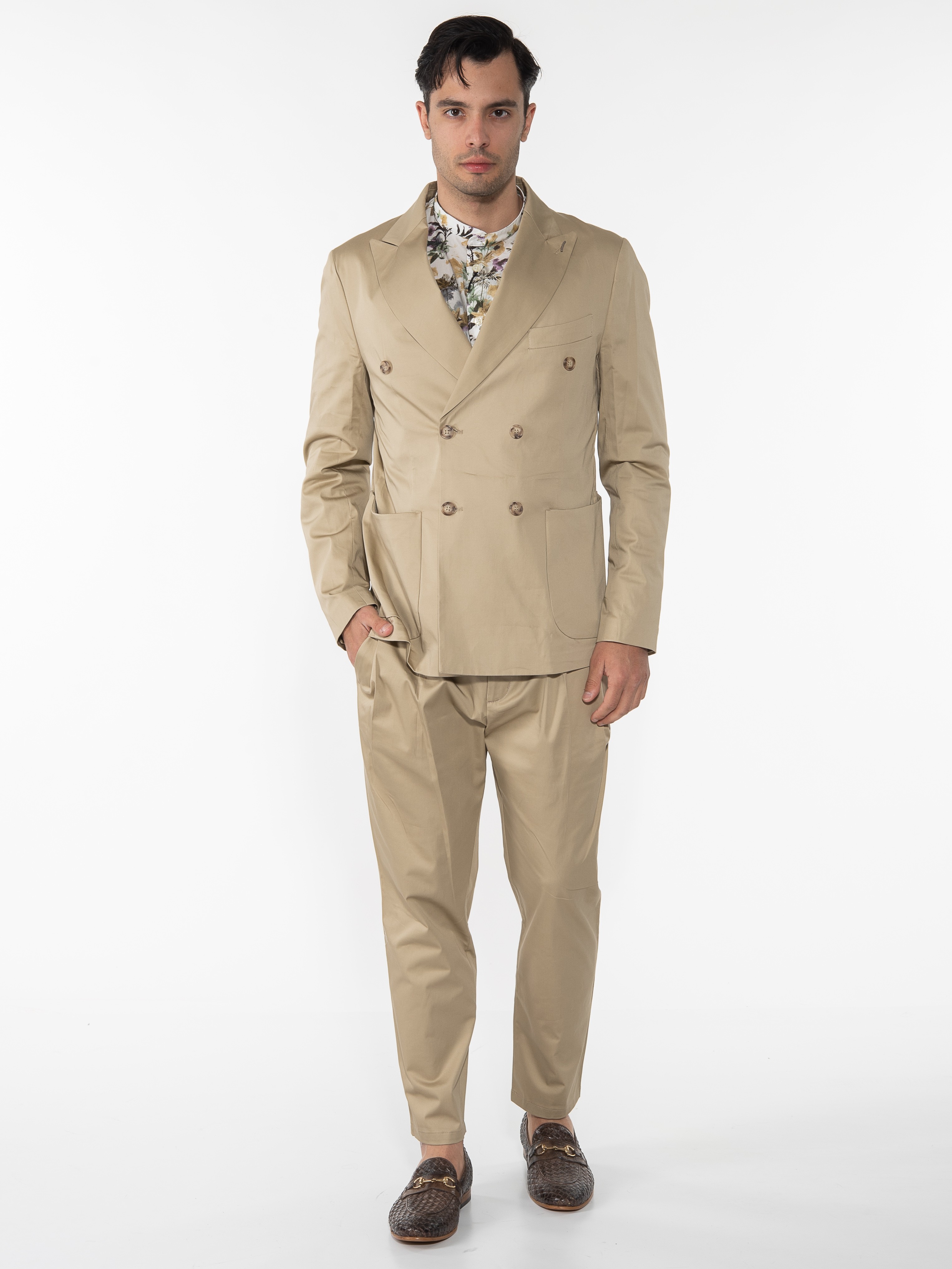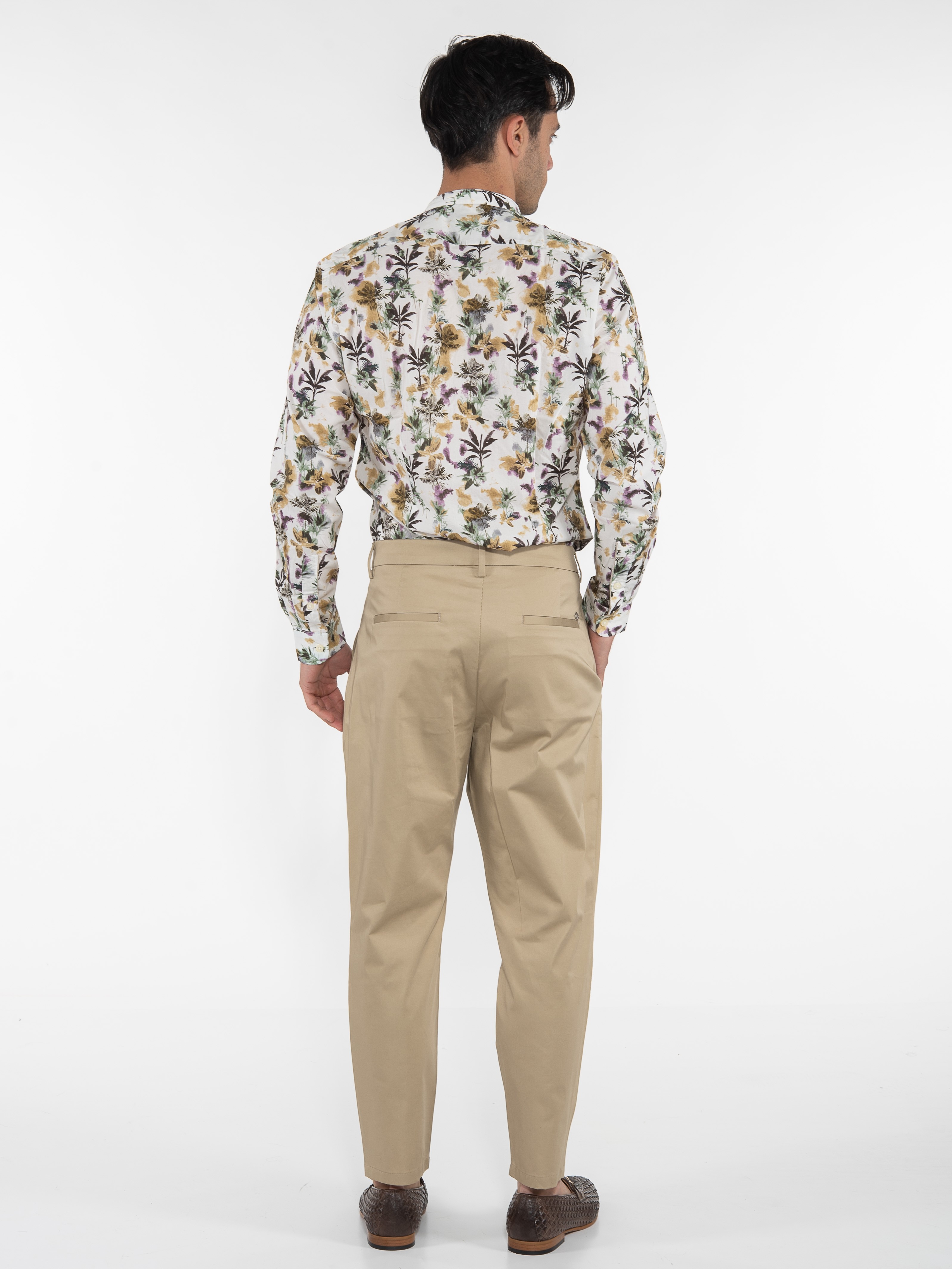 Characteristics : Double-breasted Chino Pants in regular fit line with a fillet pocket on the back side. 98% cotton 2% elastane
