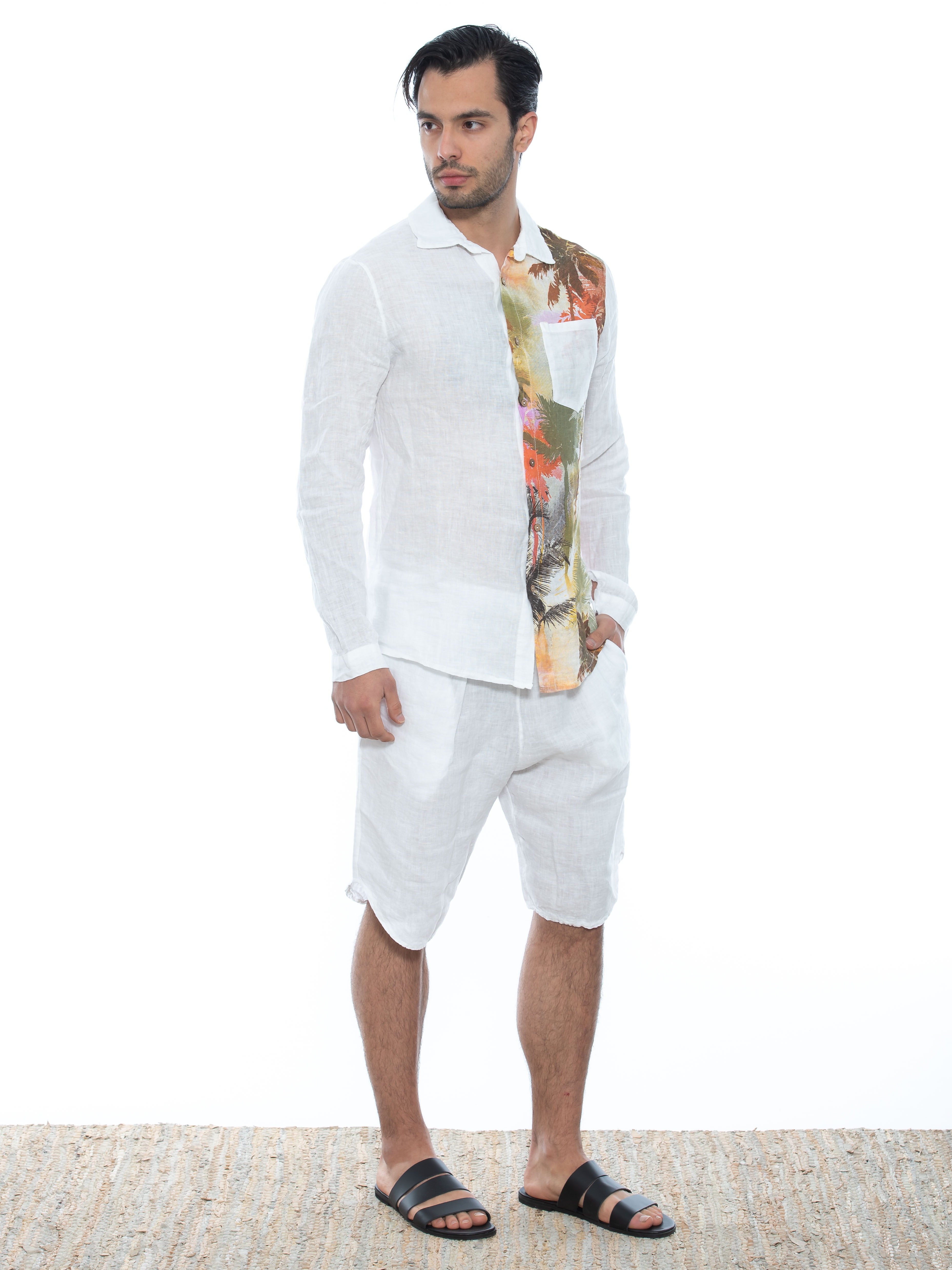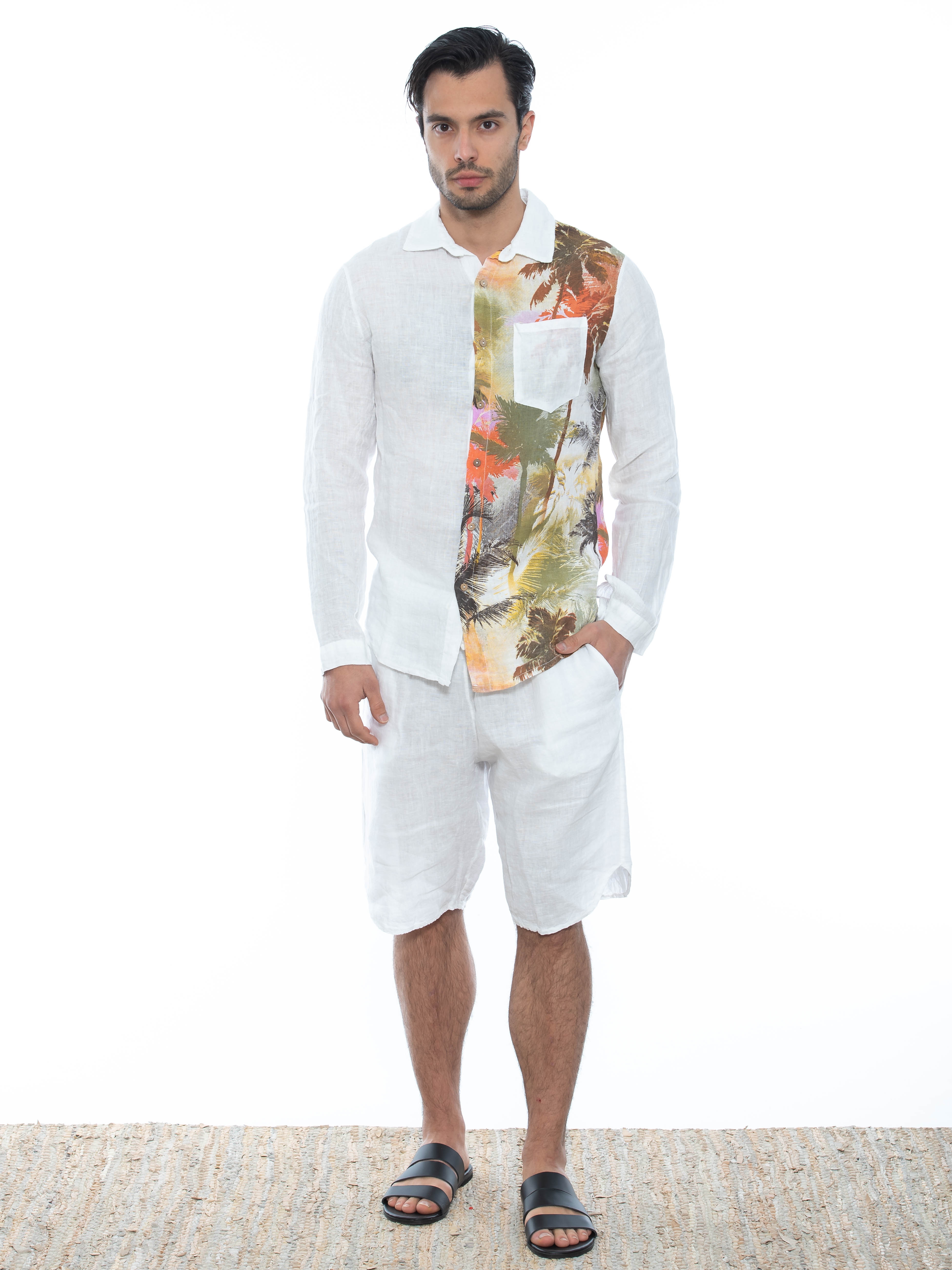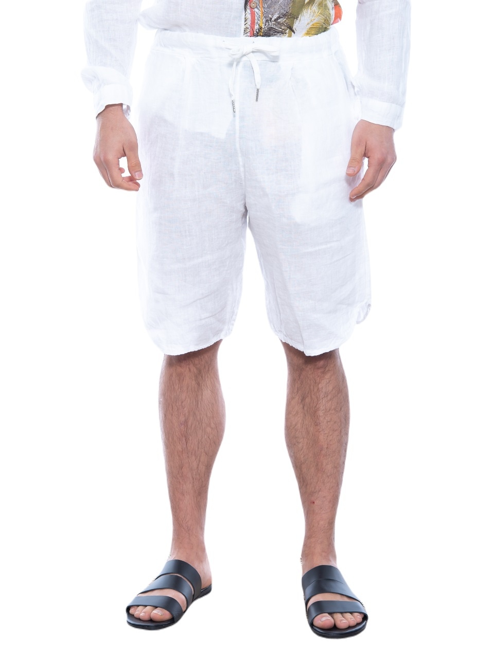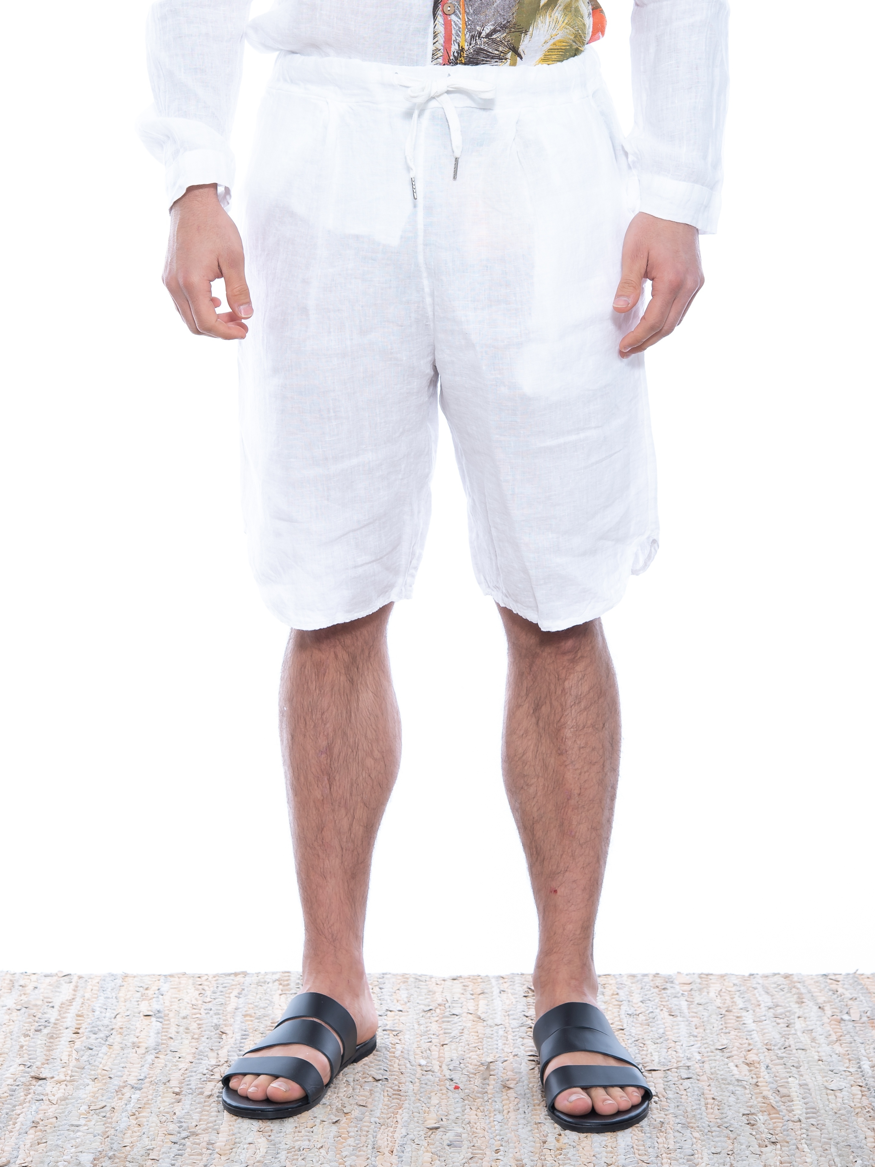 Features : Chino Bermuda in regular fit line with hollow pleat, with oval finish and with elastic and integrated belt - drawstring in the middle. 100% linen